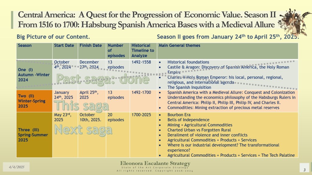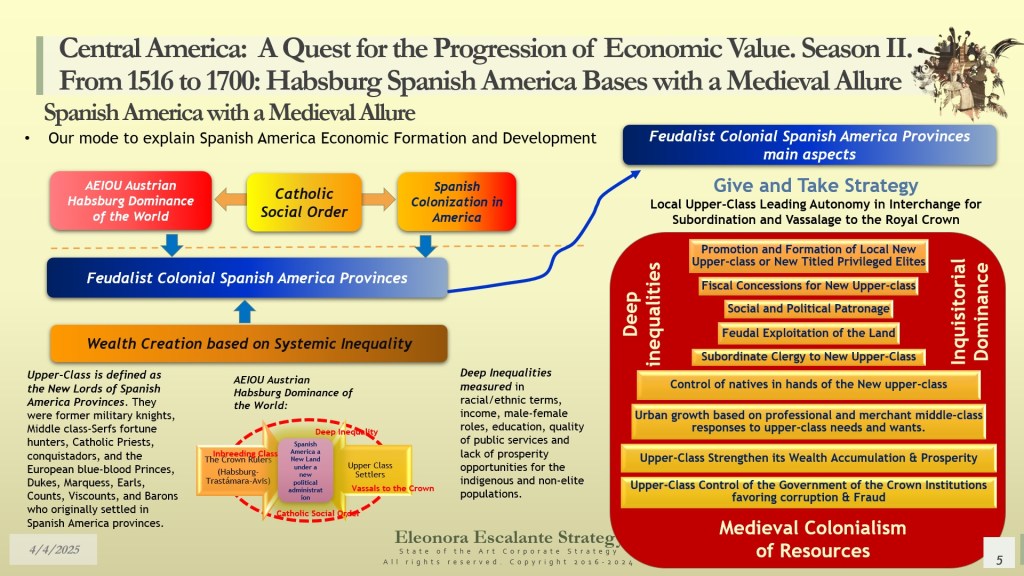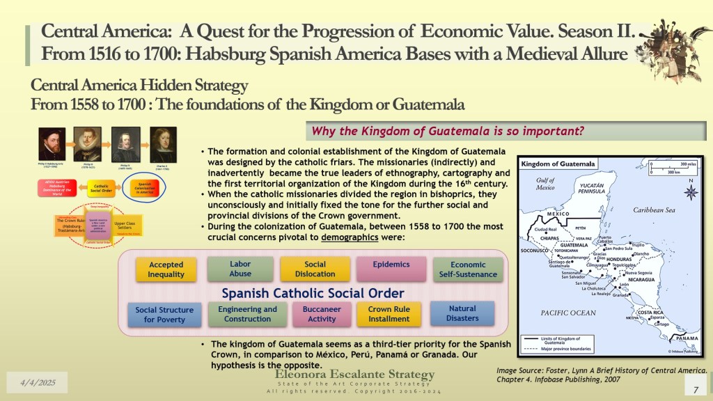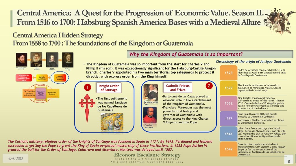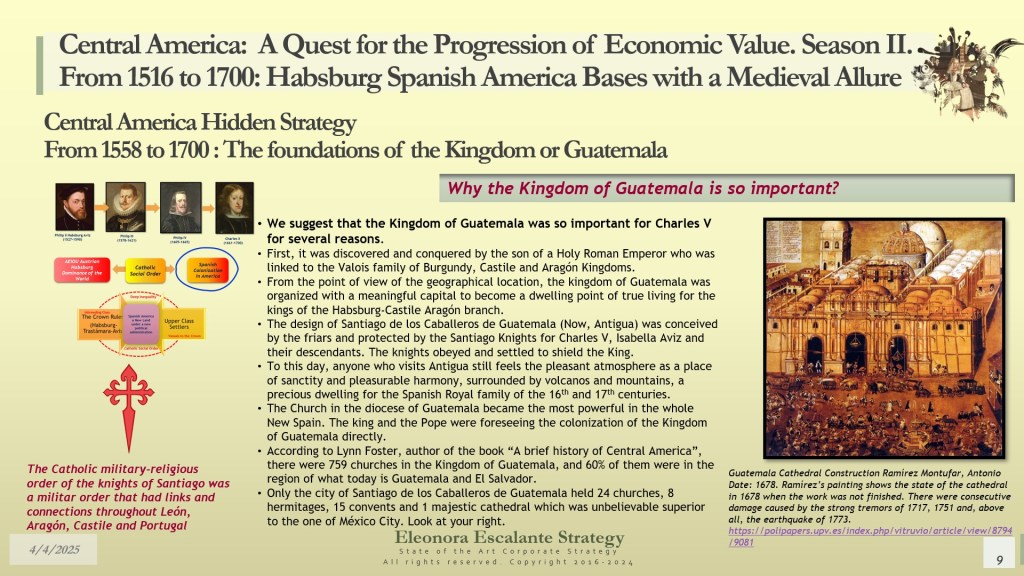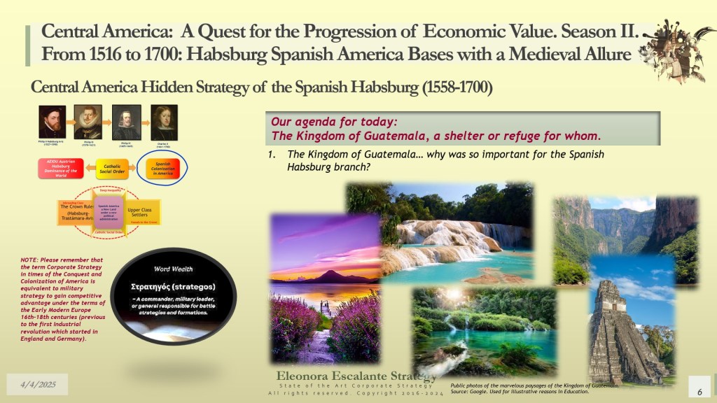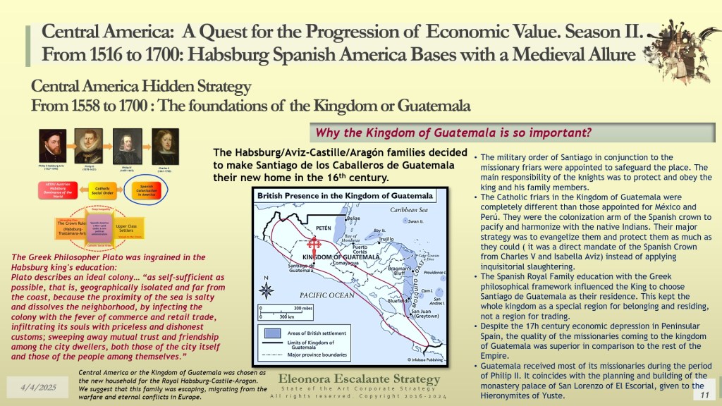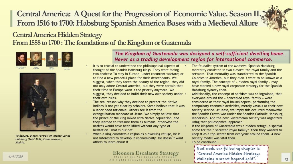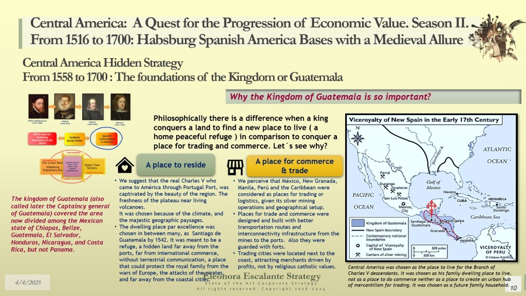 Our day’s episode is the first of 4 dispatches that will provide all the fundamentals for understanding the beginning of Central America’s Hidden Strategy between 1598 and 1700. In fact, today, we have disclosed why and how Central America (or the Kingdom of Guatemala) was designed as a shelter or refuge for the royal Spanish Habsburg family, the descendants of Charles V Habsburg-Valois-Castile-Aragón dynasty. Without that piece of the puzzle, no one was right about the economic foundations of our region. The Kingdom of Guatemala of the 16th and 17th centuries was conceived, planned, and created as a refuge, hidden shelter, and paradise for a family that wanted to escape from the disaster of their entangled conflicts with the rest of the European monarchies. The corporate strategy of the Spanish Habsburgs was of survival and settlement, not of colonization. It was a creation of a new society under their own rules, far but so far away from Spain, Germany, France, Italy, England, and the rest of Europe. A Central America with a “Tierra de los Confines”, a place where no one could bother or reach them anymore. The Spanish Habsburg kings, as descendants of Charles V, wanted a new place to dwell. We suggest that they probably found it in Central America.