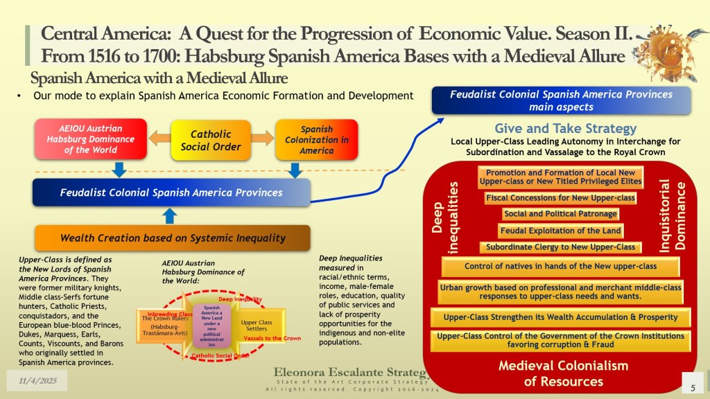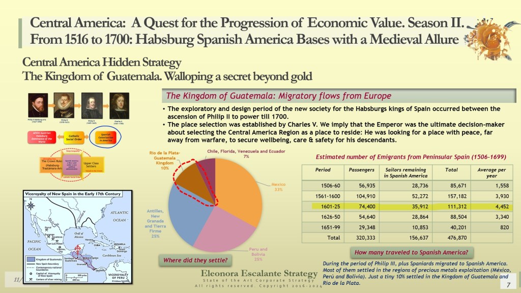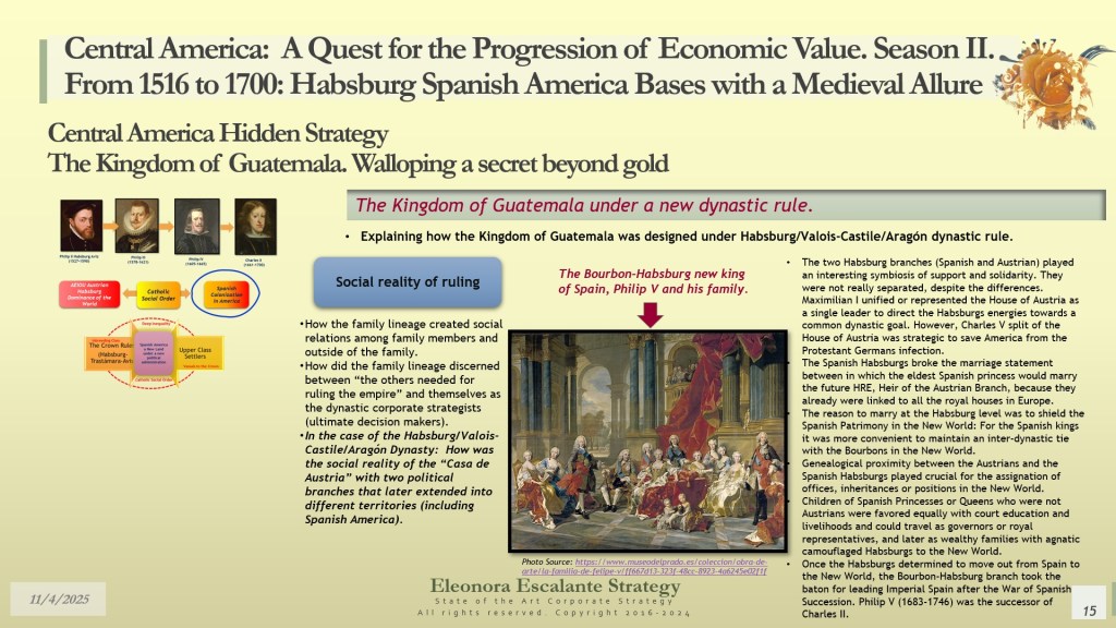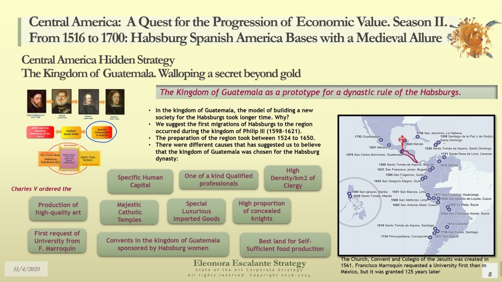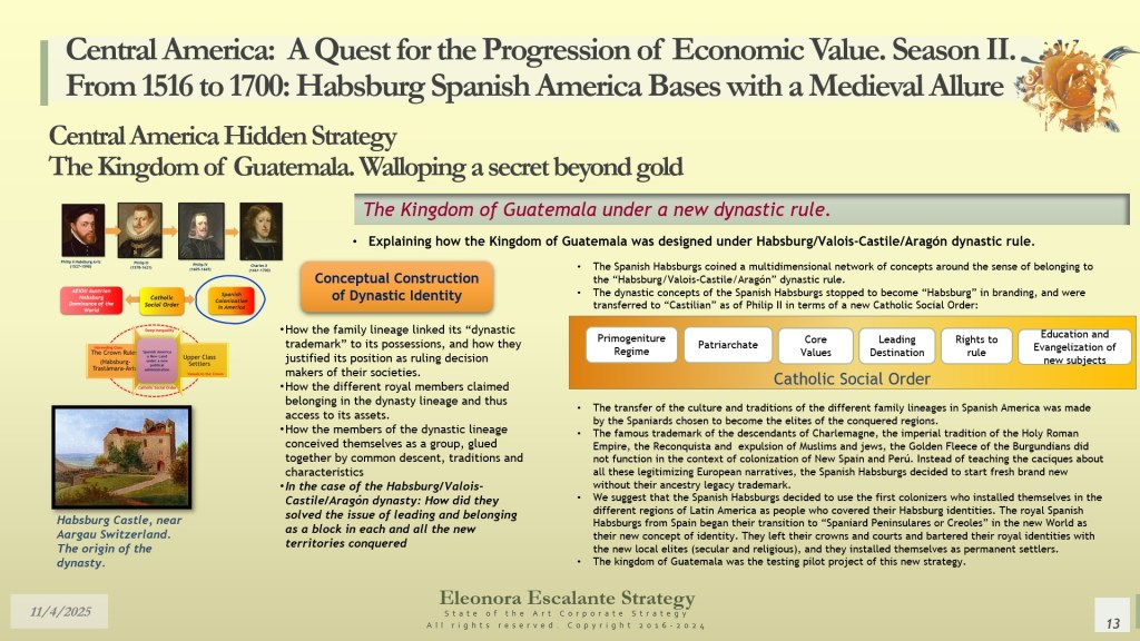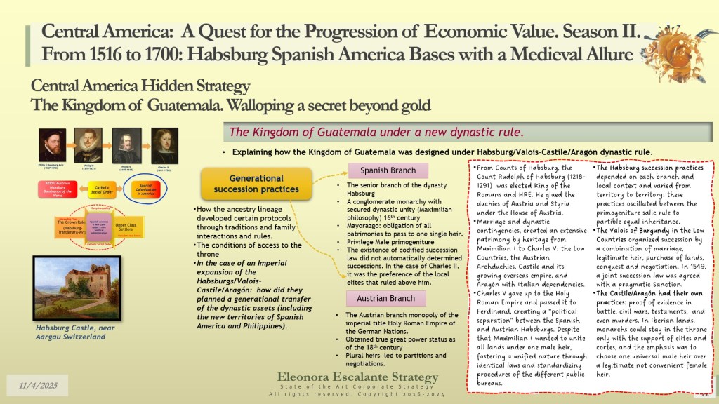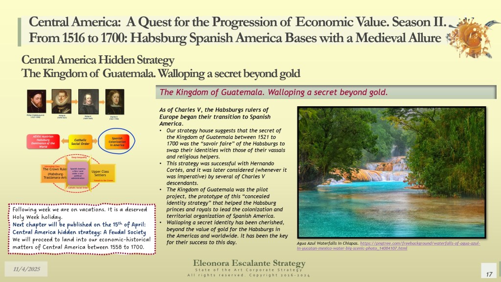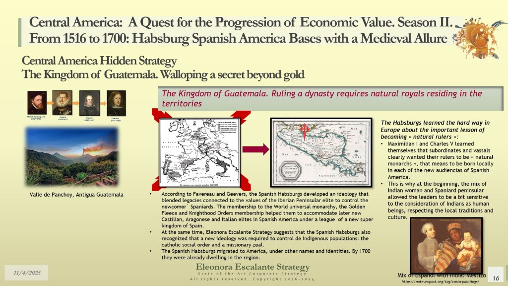 Our day’s episode is the second of 4 dispatches about the fundamentals of leadership and corporate strategy of Central America’s Hidden Strategy between 1598 and 1700. In fact, today, we have disclosed the rationale of the secret plans of the Spanish Habsburgs to move from Europe to Spanish America. Last week, we explained why the Kingdom of Guatemala of the 16th and 17th centuries was conceived, planned, and created as a refuge, hidden shelter, and paradise for a family that wanted to escape from the disaster of their entangled conflicts with the rest of the European monarchies. Today, we have shown you how the Habsburgs decided to conceal their identities in their quest to become “natural” born leaders of each of the audiencias of the region.