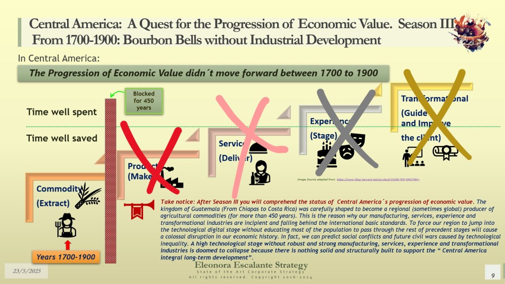 During the last two seasons, we proposed a Central America Framework of Development. It was our model to explain the origins of the Spanish American Economic Design and Formation. For Season III, we have updated it, and we have reviewed it. Our hypothesis model remains almost the same with some peculiar essential changes (visit slides 6 and 7). We have changed the “give and take strategy” between the Royals and the Spanish-American Vassals, and we switched the context of the feudalist colonial model of Spanish America. The absolutism model of the Bourbons was dissimilar to the Habsburgs. We want to reassure that it was a mix of the same philosophical medieval model, but the Bourbons were following their French nature, and the Bourbons were not aligned with the policies of the Habsburgs. This new Bourbon administration wished to perpetuate the absolute domination of Spanish American Vassals residing in the viceroyalties of New Spain and Perú. It was during this time that 2 new viceroyalties were added: the viceroyalty of New Granada and the viceroyalty of Río de la Plata. The inquisitorial repressive dominance continued through the already installed military orders that were grouped under General Captaincies, and the deep economic inequalities were based on social, ethnic, and racial differences. See slide 7 to observe our updated ideas.