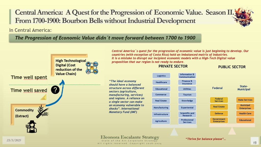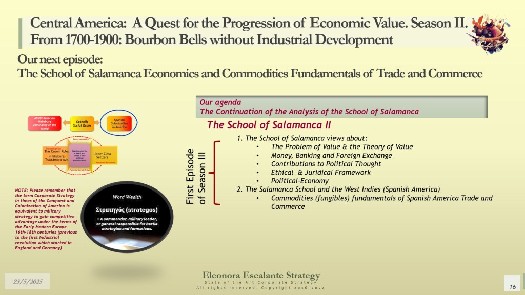 The progression of economic value of the nations of the former kingdom of Guatemala was designed since its conception without the industrialization aspects of other regions. It was defined as a region of agricultural sourcing of commodities. Any effort of industrialization was limited to certain sectors (as sugar, for example), and in general, for more than 450 years, Central America was not producing anything within the industrial standards of the United States or Europe. As of next week, we will begin our journey to identify how this happened and why. Our subsequent chapter will be about the School of Salamanca’s views on economics, and we will explore the origins of the commodities fundamentals of Spanish America Trade and Commerce.