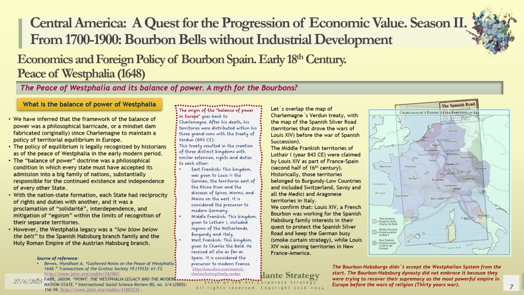1. Peace of Westphalia 101. The Peace of Westphalia was not the origin of the “balance of power” concept in Europe. Slides 6 and 7 were brought to show you that the Peace of Westphalia revolves around three philosophical aspects that we dare to remark on here. The initial prototype of keeping an equilibrium between the dynastic families ruling Europe began before the discovery of America. The balance of power idea began with the grandsons of Charlemagne. See slide 7. It started with the Treaty of Verdun (843 CE), when Europe was divided into three regions: East Frankish, Middle Frankish, and West Frankish. If you overlap the Spanish Road in which Louis XIV was fighting all his wars, that region was exactly the Middle Frankish area of King Lothair I (it included the Netherlands, all the Burgundian lands, almost all Switzerland, and Italy). This is exactly the region that the French King Louis XIV was extremely eager to bring back to the French Valois-Bourbons. See the map above, please.