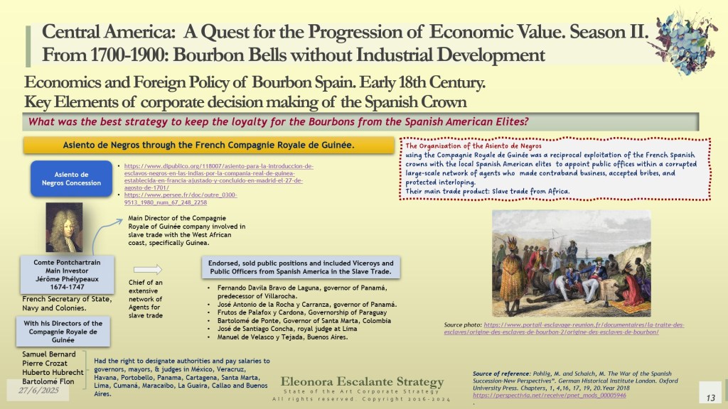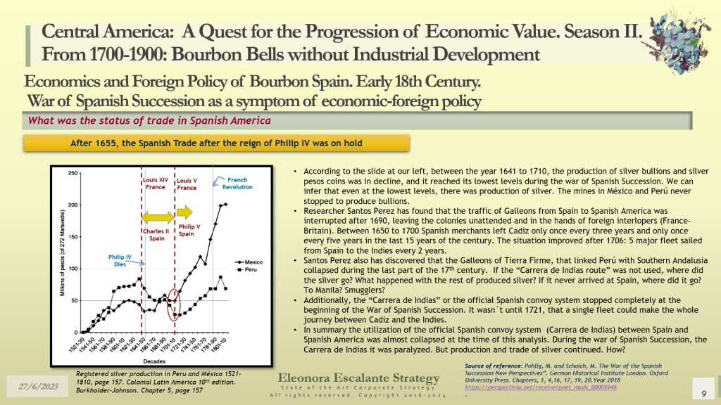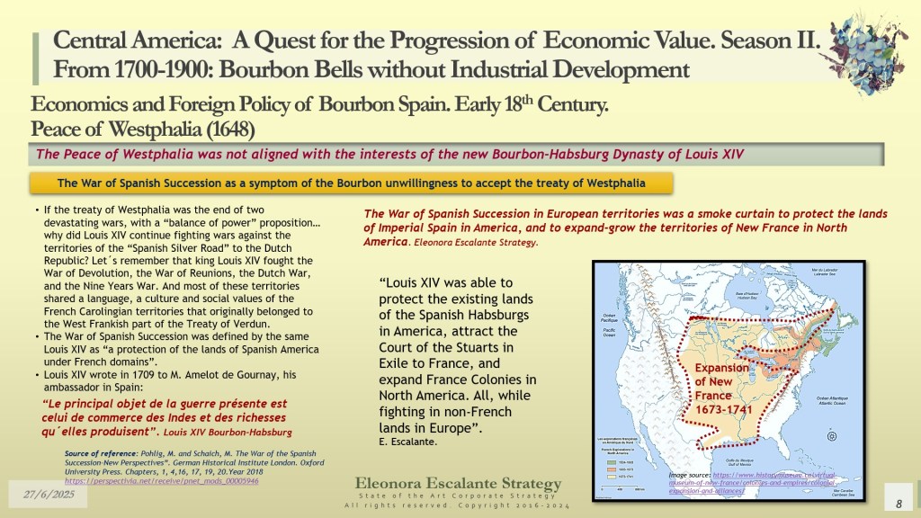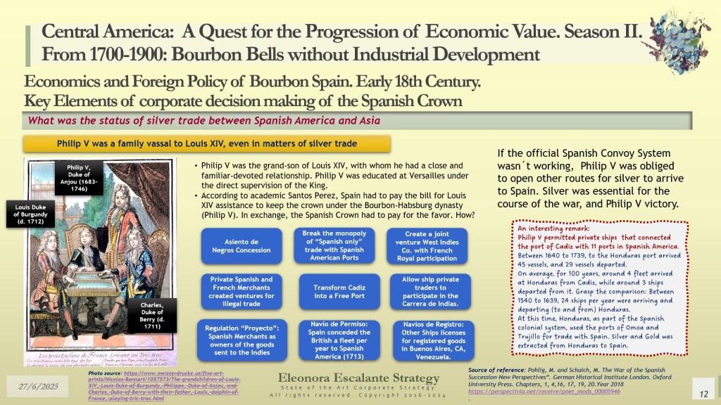 5. Key elements of corporate decision making of the new Franco-Spanish Crown: Slides 12 to 15. These slides are self-explanatory. We have tried to gather different facts that academic scholars have researched about the status of silver trade between Spanish America and Asia, how the Bourbon-Habsburg agents (under Louis XIV court Ministers and superintendents) gained or rather bought the loyalty and will of most of the governors, mayors, judges and custom duties representatives of Spanish America, and how the sale of Spanish America Public Offices continued at the highest rate in the whole history of Imperial Spain. If you are a keen observer, the conduct of public officers in Latin America of the last century to this day is the consequence of the encouragement of the sale of public offices under the Habsburgs and the Bourbons. The institutional corruption was inserted by the Spanish Crown agents, decade over decade, with the highest apex under the French Spanish duo of Louis XIV Bourbon-Habsburg and Philip V Bourbon-Wittelsbach. The colonial elites of the early 18th century got used to corruption when arriving at public power positions, and this drama has continued despite the odds of the Independence movements of the 19th century. Slide 15 is particularly noteworthy because we are not permitted to believe 100% in the official motives of the foreign affairs struggles between the Dutch, English, German Roman Empire against France and Spain. Why? All the rulers of the early 18th century were a family. All of them were linked genealogically in between. If all were relatives at first or second level of consanguinity, what were the grounds of this show? By far, the answer is not in Europe, but in America. If true, it was an insane game of thrones, in which the territories of America caused the Enlightenment, prompted the conflicts of territorial occupations in North America, and triggered future alliances that we will discover over the next month. We can dare to affirm that even the French Revolution against French King Louis XVI and the Bonaparte phenomenon, at the end of the 18th century, were also triggered by the expansion and growth of American domains of all European nations.