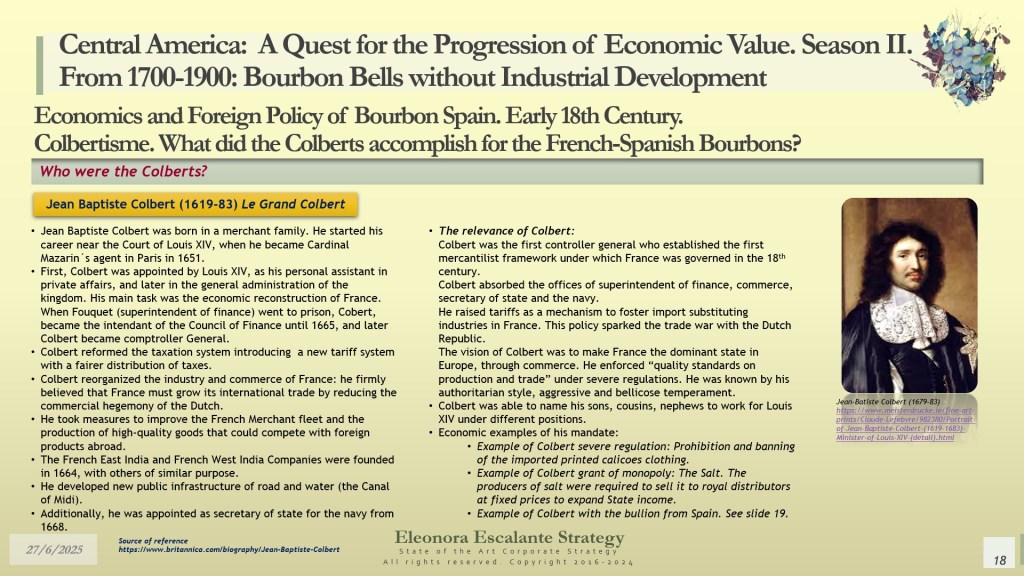 6. Colbertisme. What did the Colberts accomplish for the French and Spanish Bourbons? Slides 18 to 20. The Colberts were appointed by King Louis XIV to solve problems of the French economy. The “Grand Colbert,” Jean Baptiste Colbert (1619-83), was the first controller general, who established the first mercantilist framework that promised to help France become prosperous and wealthy. It didn´t happen for the majority of the population, but it gave fortune to the Bourbon-Habsburg family. Although Colbert´s economic thoughts were merely intuitive to create more chaos than benefits (given his lack of formal university education), Colbert´s initial measures were designed to create a robust industrial development in France. However, the extreme regulations and his sick tariff management system (see slide 20) only attracted the black market and smuggling, two of the most pestilent and harmful consequences of wrongly designed regulatory controls. Therefore, “the existence of black markets and smuggling can be viewed as unintended consequences of regulations and tariffs, as they provide avenues for individuals and groups to circumvent legal restrictions and benefit from illicit activities” (2). Look at slide 20 again, please: You can see the 6 main elements of Colbertisme that arose simultaneously during the century after Richelieu passed away. These 6 elements, all of them working together, created an exponential destructive impact on the French Economy. It was as if all the negative factors were created and bundled on purpose to defeat the French for ruining Imperial Spain. Be aware that we firmly believe that Colbertisme is not a synonym of patriotism or nationalism, despite that scholars have branded it in that way. There are prosperous countries with certain mild elements of Colbert that have reached prosperity during the 20th century, but these countries, as Norway or the United Arab Emirates, hold a treasure below their feet: oil and gas, and they are directly administering it with a certain degree of operational excellence. In the case of Imperial Spain and its Bourbon French ally, the silver extraction was not exactly in their hands, but in the hands of the smugglers and corrupted agents. One thing is true: history has proven that every nation founded on corruption, bribery, smuggling, and/or black markets is condemned to succumb (3).