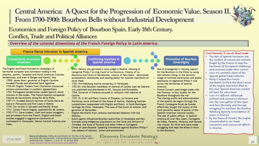 7. Overview of the colonial dimensions of the French Foreign Policy in Spanish America (early 18th century). Slide 21. Please read this slide to chronologically learn how the Franco-Spanish mercantilism was the expression of corrupted transatlantic economic situations, plus a manipulation and buyout of loyalty to the Crown, plus the promotion of Bourbon sovereignty in Spanish America.
