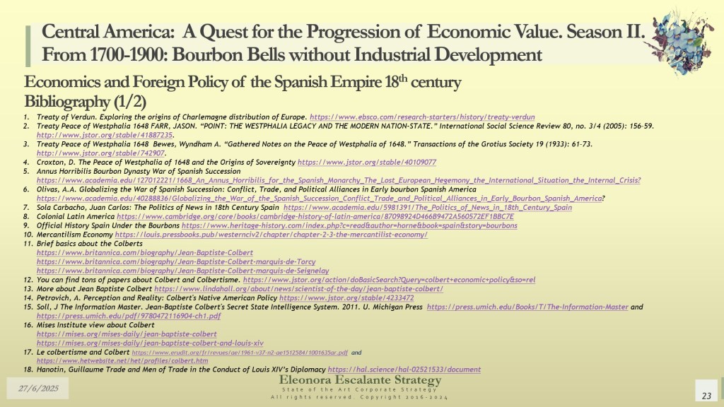 We encourage our readers to immerse themselves in the following presentation slides. Feel free to download it, print it, and explore all our content. Visit our suggested bibliographies. Do not hesitate to share our slides with your professors, family, friends, colleagues, or supervisors. We aim to be a subject of discussion over the weekend. We can´t wait to see you talking about these topics during your gatherings, particularly if you are coming from any of the maritime powers of Europe or the Spanish American countries conquered. This is a corporate strategy class that doesn´t want to be a history course. We are elevating our research to understand how the “commerce owners” of the 18th century were making decisions of “growth”, given the circumstances of that century. Even if official history has not been released with the real motives of the actions of the dynastic rulers, there is plenty of room to arrive at the truth by following the hidden signs that historians have left us in their original books. That is why we all need to dedicate hours to reading their manuscripts. Only by reading, we all will share the true past, for lighting our present, and not continue making inappropriate corporate strategies for the future. Particularly in the context of the new ubiquitous technological developments.