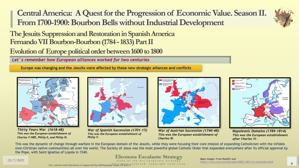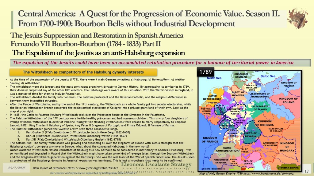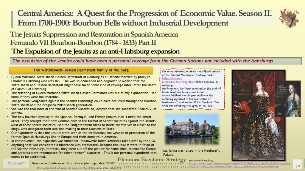 Why do we need to analyze the suppression and restoration of the Jesuits? You will read why. First, we will start by showing you that Europe (as the center of economic development for America) was dynamically changing, not just its borderlands between States, but also the monarch’s ideas. Europe was facing a bizarre recomposition of its family dynasties. The AEIOU Habsburgs´ “mission of the world” was being disrupted by the ascension to power of Habsburg former foes, a group of dynastic groups of German Families, which were predominantly Protestant. Even though the religious wars were formally ended in the 17th century, the accumulated resentment towards the Catholic Spanish Habsburgs was unstoppable on the rise. Unluckily, the Society of Jesus became a powerful arm of the Habsburgs in their quest to educate people and evangelize the whole newly discovered world. Additionally, the Jesuits were the largest school on earth (education at every level), and they were also growing in America. Second, we will continue to provide you with a brief synopsis of the Society of Jesus Taskforce’s Essential characteristics. The pinnacle of the sons of Loyola ocurred during the 18th century. More than 2,200 Jesuits were working just in the New World. The expulsion of the Jesuits ocurred first in Portugal (1759), later in France (1764), and finally in Spain and its domains in Spanish America (1767). We have analyzed the different patterns of these events. But we also explored dynastic historical reasons beyond. The Habsburgs of Castile-Aragon accumulated a series of enemies, particularly in the Holy Roman Empire. We discovered a specific pattern connected with the Wittelsbach family of Bavaria and the Palatinate, since the Wittelsbachs got close to them through marriages. We asked ourselves if the expulsion of the Jesuits was a personal revenge from the German Nations not aligned with the Habsburgs of Spain and Austria? We landed in the case of Queen Marianna Wittelsbach-Hessen-Darmstadt of Neuburg (1667-1740), the Palatinate’s second bride of Carlos II Habsburg, the Spanish sick king who died in 1700. We found in her a tremendous source of bitterness and grievance towards the Habsburgs and the new Bourbon administration. The Wittelsbach dynasty was invited to the Spanish Habsburg table because of their high-ranking fertility. The marriage of Queen Marianna of Neuburg was planned to conceive an heir for the Habsburg throne. But in the torturous process of his sterile husband, she was humiliated and repeatedly blamed for the lack of an inheritor. Eventually, she was dethroned by the first Bourbon of Spain. She was exiled to Bayonne in France, and she spent horrible years there. Yet, we have analyzed the context of the Bourbons Wittelsbach, and the Bourbons Wettin of Saxony as practically aligned with the New German English monarchy of the Hanover Dynasty. Were the Jesuits a hindrance to the Bourbons’ plans? If that is the case, then the expulsion of the Society of Jesus members was not only a removal of an impediment that was delaying the Bourbon reforms for America, but it was also a carefully designed revenge plan from the enemies of the Habsburg dynasty. Consequently, we also decided to share the point of view of Historian Jonathan Wright, who tries to answer the question: How could the most important catholic order of Europe be destroyed? Finally, we reveal to you how the reestablishment of the Society of Jesus happened in 1814, after 41 years of its displacement. King Fernando VII Bourbon is our last slide of today.
