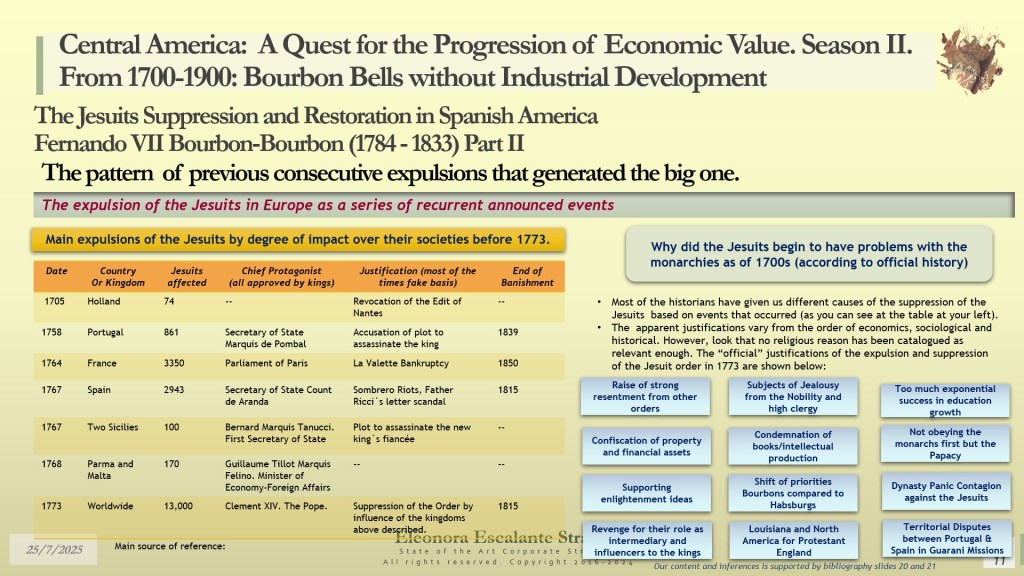Our corporate strategy house has X-rayed the 8 essential characteristics of the Society of Jesus in the 1750s. Please read slides 7 and 8. By this time, the order had existed for more than 200 years, and its successes in education were being harvested and recognized everywhere. The scent of Catholic Europe was coined with the Jesuits. Educational Europe was largely and mainly on the shoulders of the Jesuits. The order of the Jesuits was at the pinnacle of its worldwide presence at that time. They were dispersed all over. In America, from the great lakes of the frontier with Canada, passing through all of Louisiana, México, Central America, New Granada, Perú, down to the Patagonia. They were also in India, China, and many other places in Asia. See slide 9 to verify their educational presence in Europe and their missionary critical authority in Spanish America. The Jesuits’ omnipresence in every Catholic European nation and colony, mixed with their strong connections with the royals of each Catholic dynasty, together with their educational core backbone, made them a “too big to fail.” That attribute was supposed to keep them untouchable. “Too big to fail” happens when an entity is so important to a society that a government or monarchy would not allow it to perish or be abolished due to the seriousness of the consequences. However, the German Bourbons and the German British Hannoverians thought that the Jesuits were not needed anymore (they had already finished all the conversion of the Natives of Spanish America, and they had created a robust educational system that any other order could take over and use). Suppose you see it with a magnifying glass, despite that the Wittelsbach of Bavaria were catholic, the Protestant Germans as a block were not planning a catholic development for the future; on the contrary, their vision was of a new protestant culture, with a new industrial economic system, and a different version of educational practices. The brick-and-mortar Jesuits’ establishment, with its educational work of 200 years, was an impediment, a hindrance, an obstacle that was required to be removed, and passed to other orders of their convenience. And that is what the three kings with economic interests in America did. The Portuguese Braganza-Wittelsbach, the French Bourbon-Wittelsbach-Savoy, and the Spanish Bourbon-Farnese Wittelsbach. These three monarchs decided to get rid of the Jesuits, expelling them under equal conditions as when the Jews and the Moors were expelled from Spain.