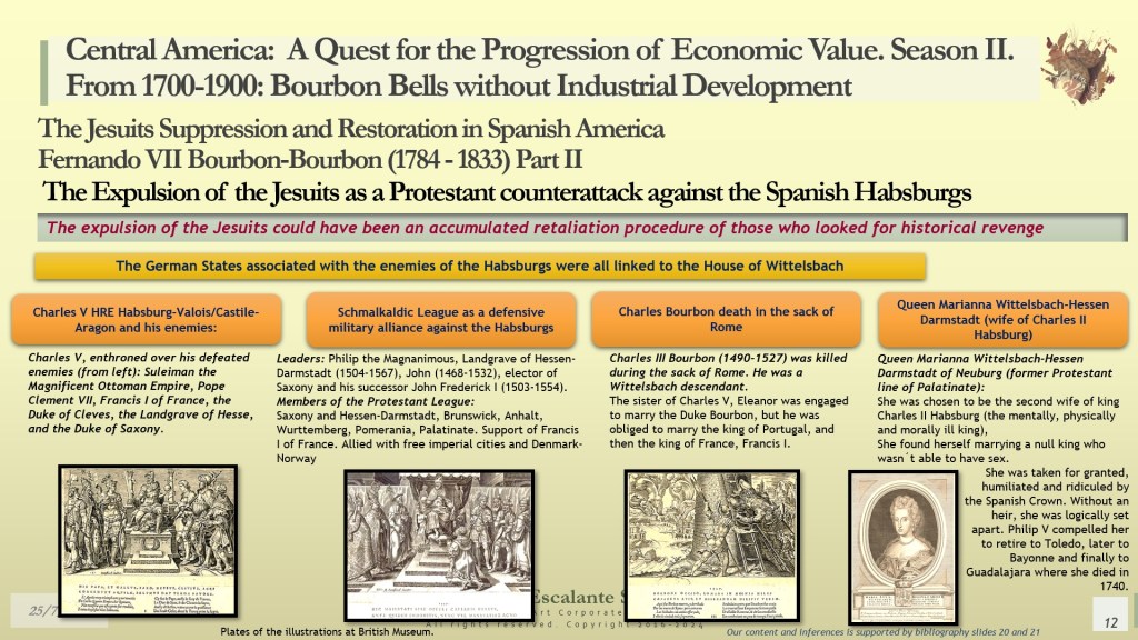 From slide 11, none of the multidimensional mix of the 12 justifications written by historians is as relevant as understanding the expulsion of the Jesuits from the perspective of the pursuits and revengeful feelings of a family. Particularly, in the context of a family that has been hurt so deeply. At the end of the day, it doesn´t matter if the Wittelsbachs were protestant (Rhine Palatinate) or Catholic (Bavaria). It was more than a religious family response. It was a family block that proceeded with an accumulated reaction as a historical, sociological, economic, spiritual, and personal/family vengeance. It was a block of leaders that represented so many other German Families that wanted revenge against the Senior branch of the Spanish Habsburgs, which was so weakened then, only in Europe. As we explained above, Marianna Wittelsbach-Hessen Darmstadt represents that grievance.