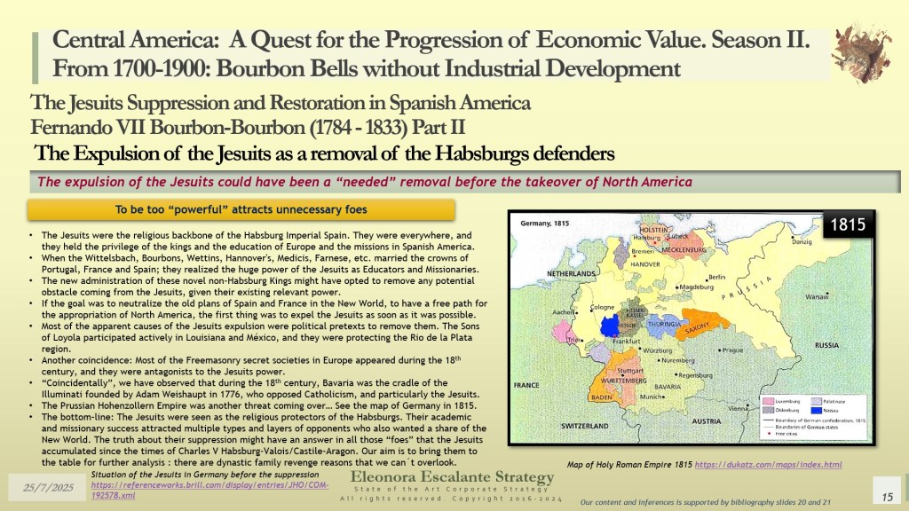 The temporal expulsion of the Sons of Loyola from the Catholic Church (1773-1814) was not against the Jesuits because of them, but against the position that they had held for 200 years with the Habsburgs. Please read that sentence again: it wasn´t because they did a bad job or not. It was because they were too big to fail. The Jesuits’ cumulative achievements for the Habsburgs were enormous. And the new German administration coming over for America wanted them out for some time. The Jesuits were the ultimate hindrance that stood in the way of the new territorial and power recomposition. The suppression took the Jesuits by surprise, as they held the “too big to fail” fallacy inside their hearts. Sadly, we believe they were seen as the Catholic representatives of the AEIOU mission of Maximilian I Habsburg. Even if they weren´t. But they were seen as a blockage against the new plans of the Protestant Germans (including the Germans from Britain). The non-Habsburg Germans sought a share of the wealth created by the Spanish Habsburgs, and the Jesuits were the main obstacle that was taking care of those Habsburg interests worldwide. The Congress of Vienna, held in June 1815, following Napoleon’s final defeat, attested to the growth of Prussia tied to the Netherlands and England. By that time, Louisiana of America was hijacked from the French Spanish Bourbon domains. Then and just then, the Jesuits were restored. See slides 16 and 17.