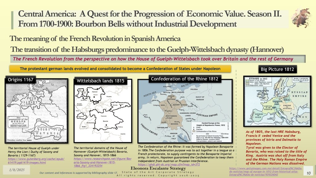 Slides 10 and 11 are a refreshed evolution image of the German lands under the Wittelsbachs (Catholics and Protestants). Look that there is no relevant difference between the geographic extension and location of the duchy of Saxony and the duchy of Bavaria of 1167 (all under the Guelphs-Wittelsbach) and the territorial domains of 1815. Even the confederation of the Rhine, allowed by Napoleon Bonaparte in 1806, implies a clear vindication of the Wittelsbachs against the Habsburgs. It seems to us that the house of Guelph Wittelsbach was moving its influential buff through the new Freemasonry fraternity clubs of France (Gerondins, Jacobins, Masonic lodges, Illuminati, etc.). This only happened because the Jesuits and the Catholic priests were the first ones to be eliminated in France. The first steps to destabilize the French Regime were taken to debilitate the Catholic clergy with a specific purpose: to take America back. King George III of Britain thought that the Revolution against the Bourbon dynasty was a “divine retribution for the French Intervention in the American Revolution”. Great Britain did nothing to stop the French Revolution because King George III (a pure German Protestant Guelph-Wittelsbach-Saxe Gotha) knew that France was going to be weakened by it. For King George III, a damaged France meant a possibility to find a new path to recover its lands in North America.