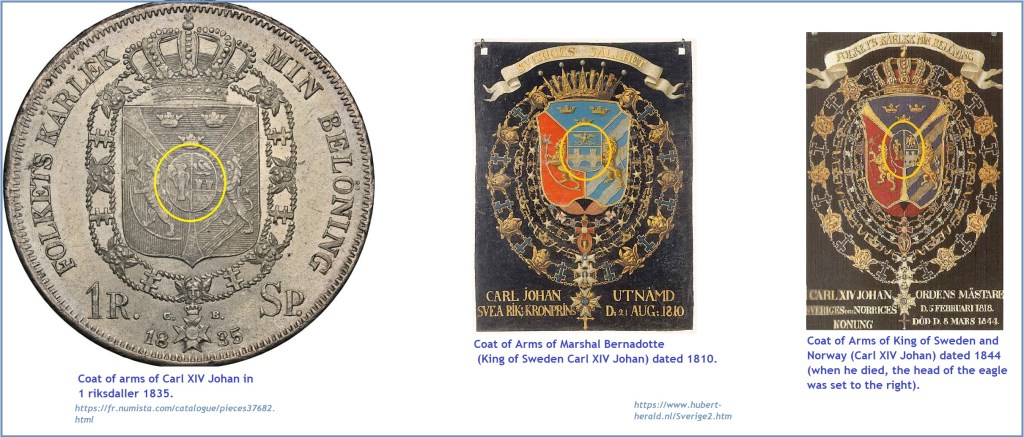 - King Karl XIV Johan (Marshal Jean Baptiste Julius Bernadotte) (1763-1844). See slide 6. Regardless of the storyline of the official narrative, we propose that the reward for the good job of Bonaparte was to name him ruler of the highest kingdoms of Europe: Sweden and Norway. We have filtered numerous portraits, and we have compared him with those of Napoleon (when he was young). Despite the physical similarities, it looks like the heraldry of Bernadotte gives continuity to the Imperial Bonaparte rule. Notice the eagle rising with the sinister head (to the left), wings elevated and inverted in both coats of arms, with the same colors (azure and or). See the image of the king of Sweden’s heraldry below, please. All the heraldic interpretations of this analysis are based on 7 historical books of heraldry that we have shared below (in our bibliography).