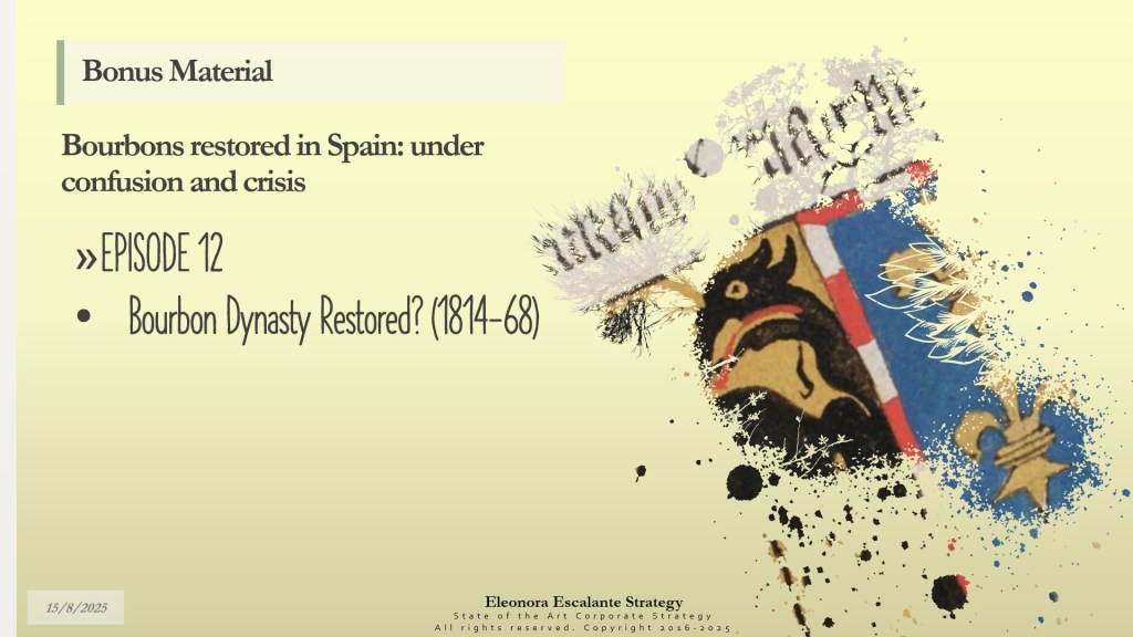 This episode is about the contextual and political situation of the monarchical strategy of Spain during the 19th century. A period characterized by a pendulum of multidimensional oscillations between the absolutist reinstatement of the Bourbons and the Liberal moves to change the government into a democratic or, later, a republican State. We can perceive the roadmap of the Bourbons’ struggles while trying to keep Spain afloat in the middle of “a process to develop a constitutional monarchy against their will”. The tensions between all the players were many times antagonistic, opposed radically to each other, and the ascension of a disgruntled new military class not only complicated the resolutions to the problems, but aggravated additional troubles. The ruling period of Ferdinand VII and Isabella II, after Napoleon, was established on muddy sand waters. The Spanish Bourbons were not really restored during this century of analysis. Isabella II abdicated and moved to France in 1868, leaving a provisional government that was subsequently established as the First Bourbon Republic. Coincidentally, it was during this period that Imperial Spain lost all the territories in America. The former Viceroyalty of New Spain (now México) also renounced the rest of the Spanish North American domains. There is a lot to learn during the following weeks. See you in our next episode. Thank you.