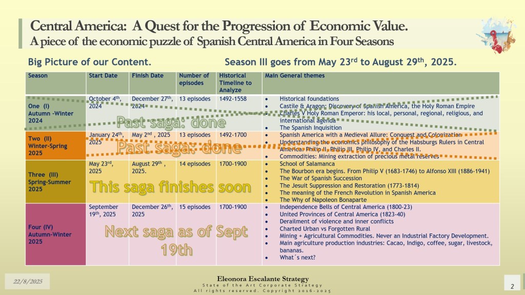 This master class is the avant-dernier episode of season III. We are close to finishing the analysis of the Iberian Peninsula geopolitical situation between 1700 to 1900. After our next episode, we will take two weeks of recess. Our next season IV, which starts next Sept 19th, will be about the political economy situation in Central America, and we will cover all the main economic sectors (incipient agro-export industries). There is a lot to learn during the following weeks. See you in our next episode. Thank you.