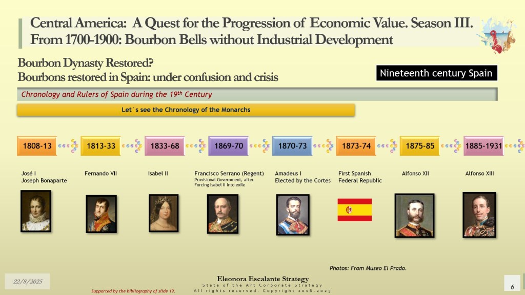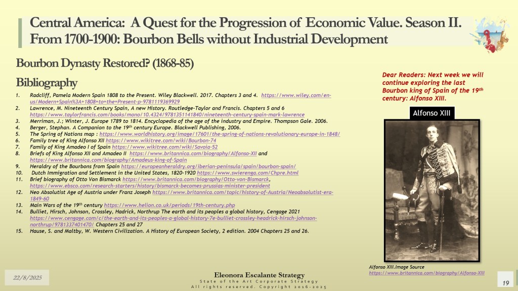 Find our frame of reference below. Feel free to share it with your friends, professors, acquaintances, and colleagues. Print the slides, and read them carefully. Look for further information beyond our bibliography. Write your questions and notes on paper. This is a crucial episode because most of what Spain is reaping today is linked to the decision-making of this century. We have attempted to disentangle the political buzzword from the complex political conflicts, inviting you to view this period as the consolidation of what the militaries, then, replicated in Latin America during the 20th century. You will understand why today. From an economic perspective, we also wish to highlight who supported which incipient economic model and how Spain lost its unique business development pioneering spirit by following the rest of the European Great Powers (mainly Britain and France) in matters of monarchical decision-making. The 19th century represents a span of 100 years lost for Spain. In the 19th century, Spain was trying to reconfigure its own political model, soothing revolts, igniting chaos, defusing the entrance of the socialists-anarchists, appeasing the elites, controlling the Carlistas and Alfonsistas Bourbons in the Peninsula, lulling the Cuban-Separatists, while relying on a repressive militarism. In a domino effect, Latin America was also left behind, not only because our rulers were unable to find an economic model (there wasn´t one specifically created or designed for Latin America, but only an incipient one for Britain-Germany, and another one for the migrants living in America), but because our darling continent was being protected from the political mess of Europe. Our hypothesis about several waves of relevant members of the Dynasty Habsburg-Castile-Aragon-Valois coming to America, before the rise of the Bourbons in Europe, is not unreasonable or illogical. You will find out why we are closer to confirming it.