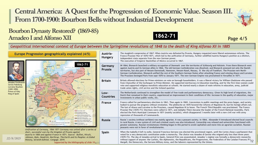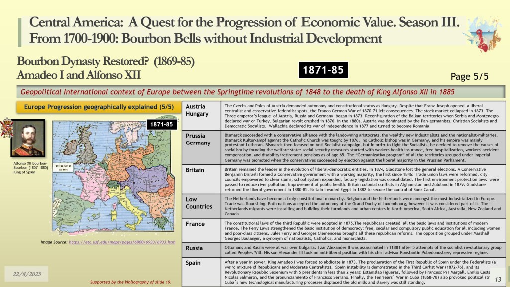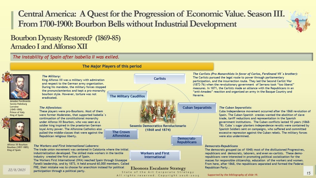 Central America: A Quest for the Progression of Economic Value. Season III. Bourbon Dynasty restored. Amadeo I and Alfonso XII