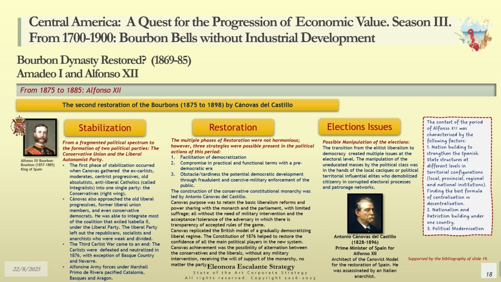 Finally, our last slide 18 is about the Alfonso XII period. His authority as a king in power was the second restoration of the Bourbons in Spain after the Joseph Bonaparte years. Alfonso XII delegated his decision-making to his prime minister, Antonio Cánovas del Castillo. The rebuilding of the constitutional monarchy was a process of three steps: Stabilization of all the main social and political forces in the territory, the Restoration per se, and finally the election process (which had multiple issues). Our analysis about this period is clear: no economic prosperity can rise if there is no peace and a major degree of tolerance, respect, and confidence between the leaders, institutions, and a righteous system of justice for all levels of society. And Spain was still far, but far from attaining these key performance indicators in its quest to define the “modus operandi” of their own society. Slide 18 is self-explanatory.