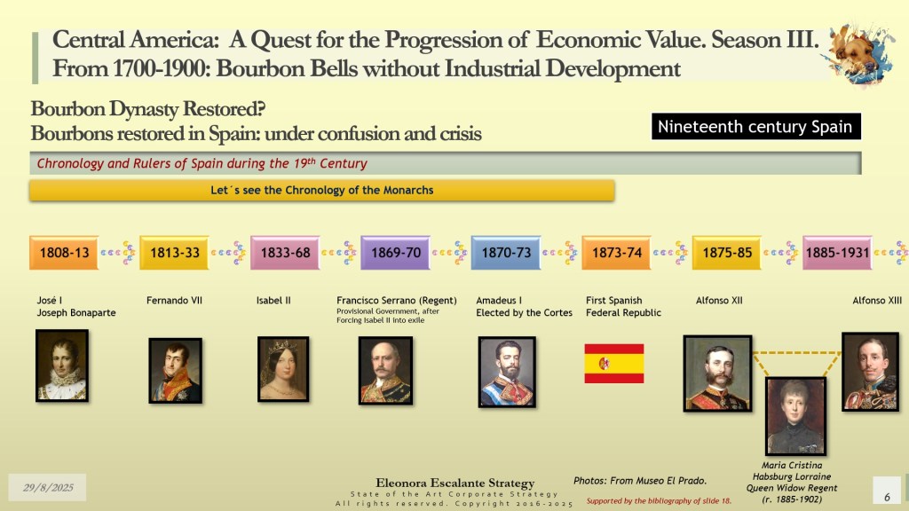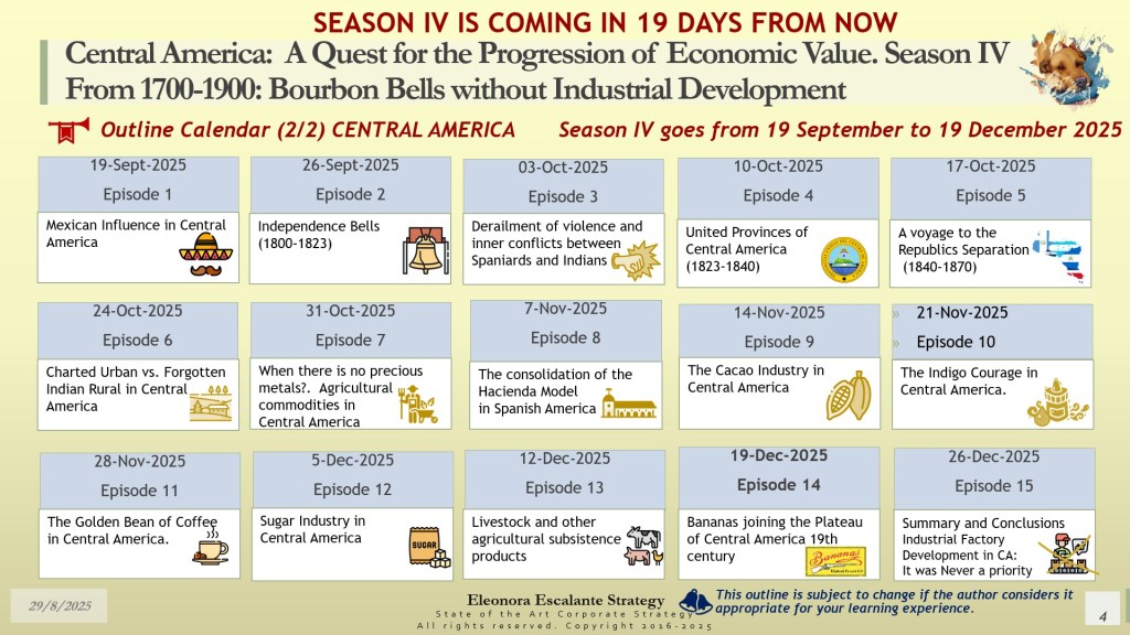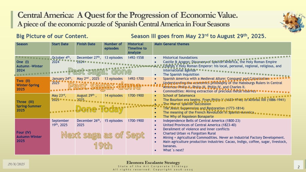 This master class is the last episode of season III. We are only closing our strategic interpretation of the history of the Iberian monarchical decision-making between 1700 top 1900. There is much coming with season IV. Our next season IV, which starts next Sept 19th, will be about the political strategic economy situation in Central America, and we will cover all the main economic sectors (incipient agro-export industries). We are so content with the production of the last three months, and we are looking forward to Season IV, outlined below. Thank you so much for your patience and for your attention to this saga. The best is yet to come…