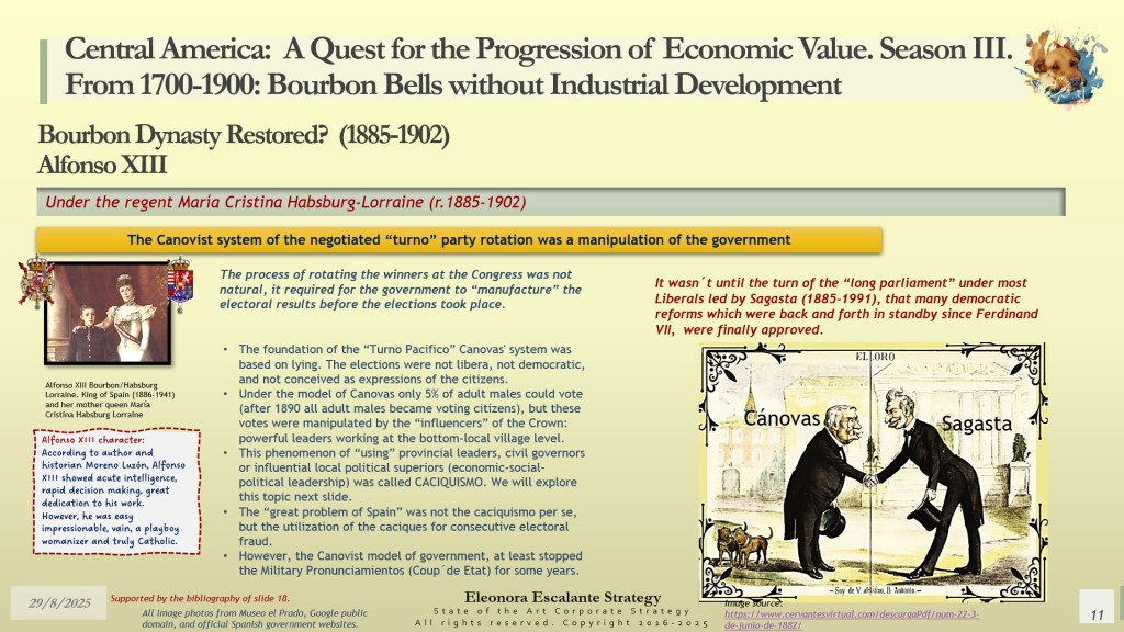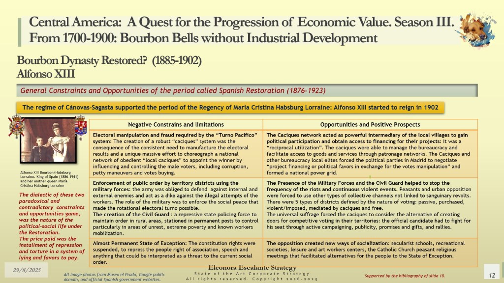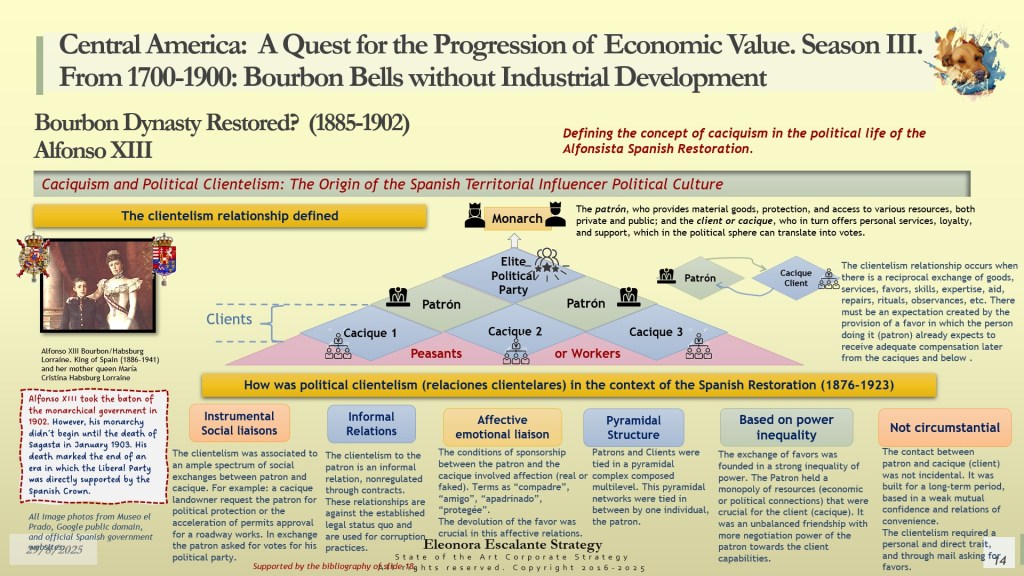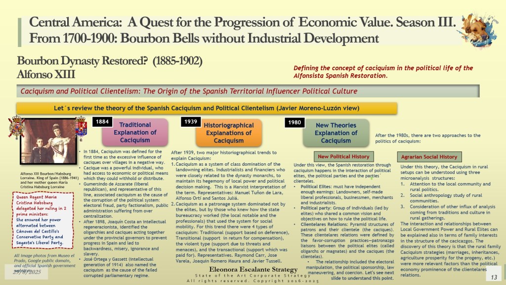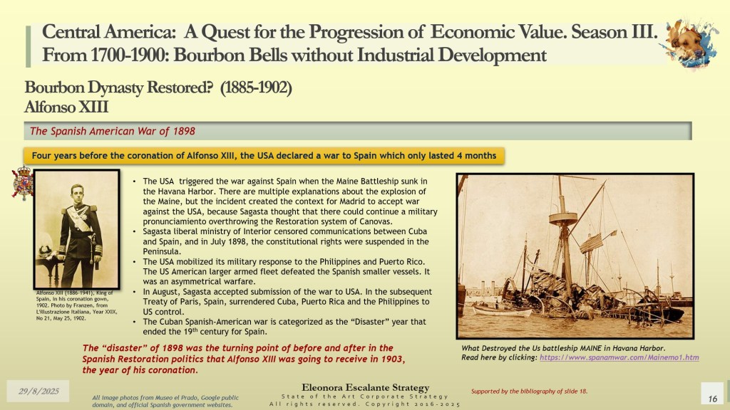 Our framework of reference agenda for today includes not only the family historical tree of King Alfonso XIII and her mother, María Cristina Habsburg Lorraine, but also we have dedicated several days to understanding the theories behind the political clientelism and caciquism, two linked phenomena that were intrinsically intertwined as crucial factors of the period called Restoration of Spain between 1876 to 1923. We are closing our episode with the Spanish-American War of 1898. Feel free to share our material with your friends, acquaintances, professors, family members, bosses, and colleagues. All our slides of this saga are of indispensable significance for anyone who wants to work or is related to Latin American prosperity and economic improvement. We can´t walk in this life without these analytical, strategic reflections about our history. If you do it, it is as if you are in a dark funnel without a strategic compass. In my personal case, I have a different new perspective about how to implement the correct frameworks for Latin America corporate strategy now than what I had before the year 2023.