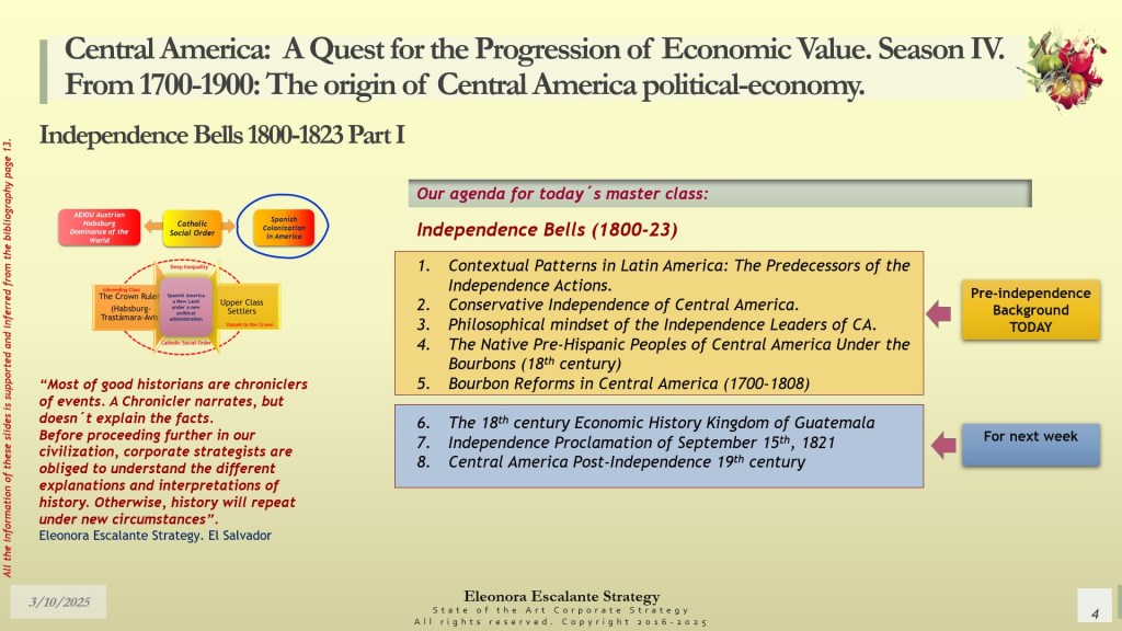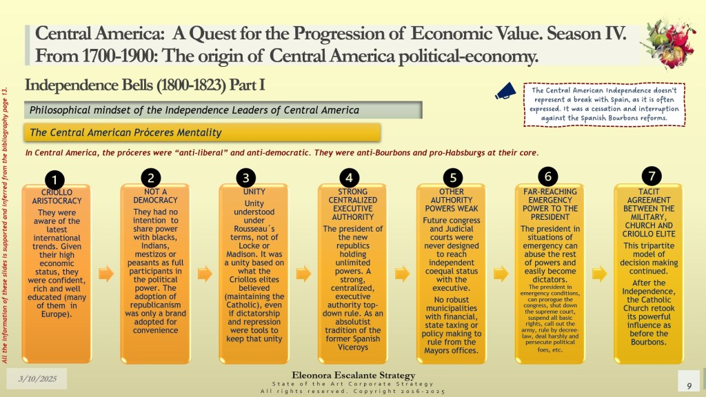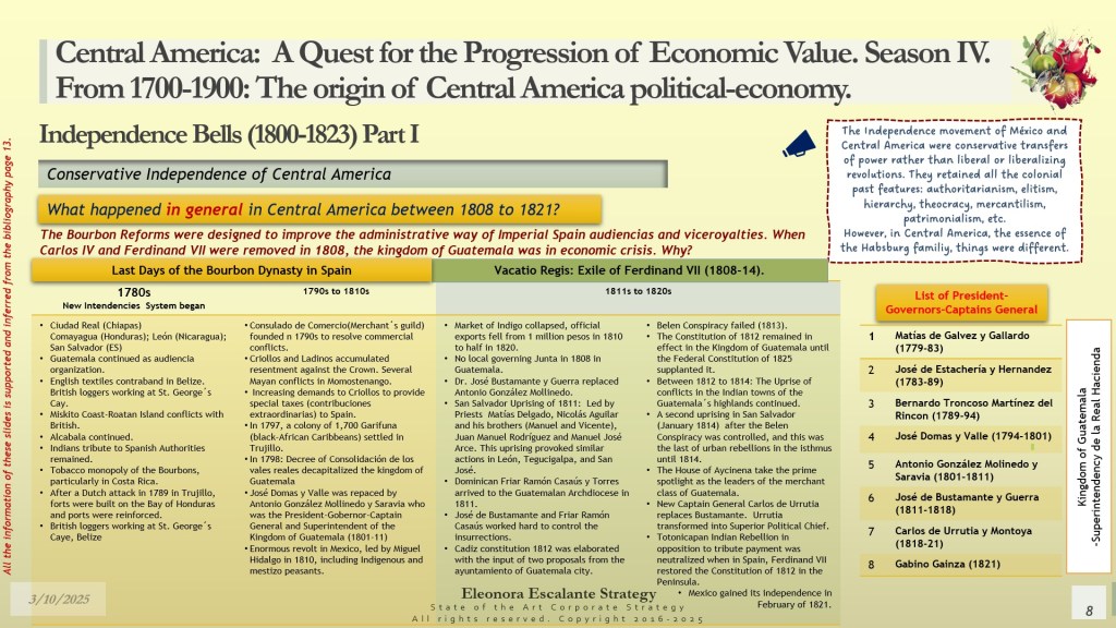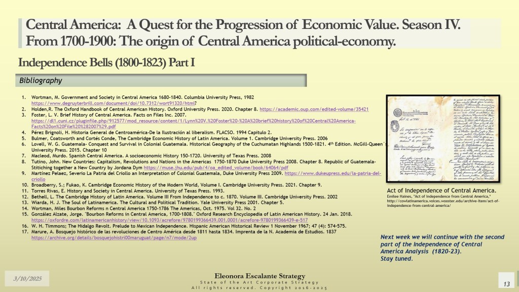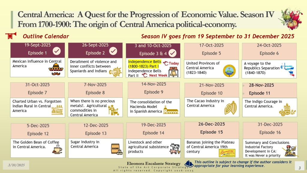 Episodes 3 and 4 are exceptionally special. Most of the teachings about the Independence revolutions of Central America that have been passed down to us will be inspected and positively shattered in our analysis. And this fact has compelled us to divide the content into two. Today, we have introduced the foundations of our further study, which will be completed with Episode 4 material. Our next episode is “Independence Bells (1821-23) Part II.” See you again next Friday. Remember, we will add our total strategic reflections for the two episodes in episode 4. Thank you for reading to us.