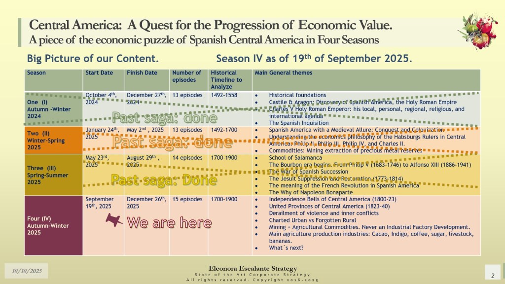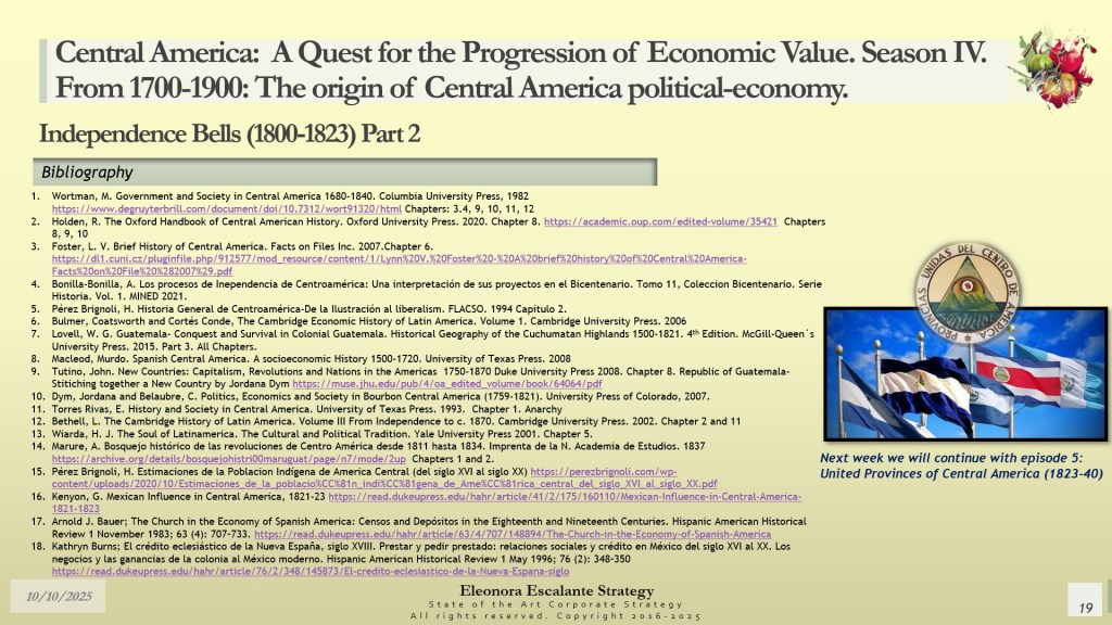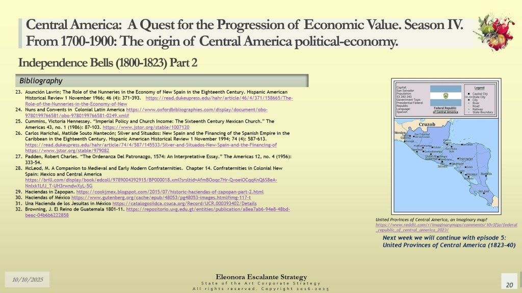 Episode 4 is a duty journey. It mainly provides an explanation of how the Catholic Church was responsible for organizing colonial life in Central America, with ample details. The Church ruled and maintained the social, cultural, economic, and political interactions between two worlds: the pueblos indios (where the mendicant orders first evangelized, controlled native labor, and later developed monarchical institutions tied to religious Christian values), and the Criollos villages or new cities. Both groups of peoples had different backgrounds and economic interests. The Catholic economic structure was the backbone of Central America, previous to the Bourbon Reforms. We have also covered the Independence situation between 1821 to 1823. We believe that this research will be useful for further episodes, particularly once we finish the analysis of our next episode, the United Provinces of Central America. See you again next week. Thank you for reading to us.