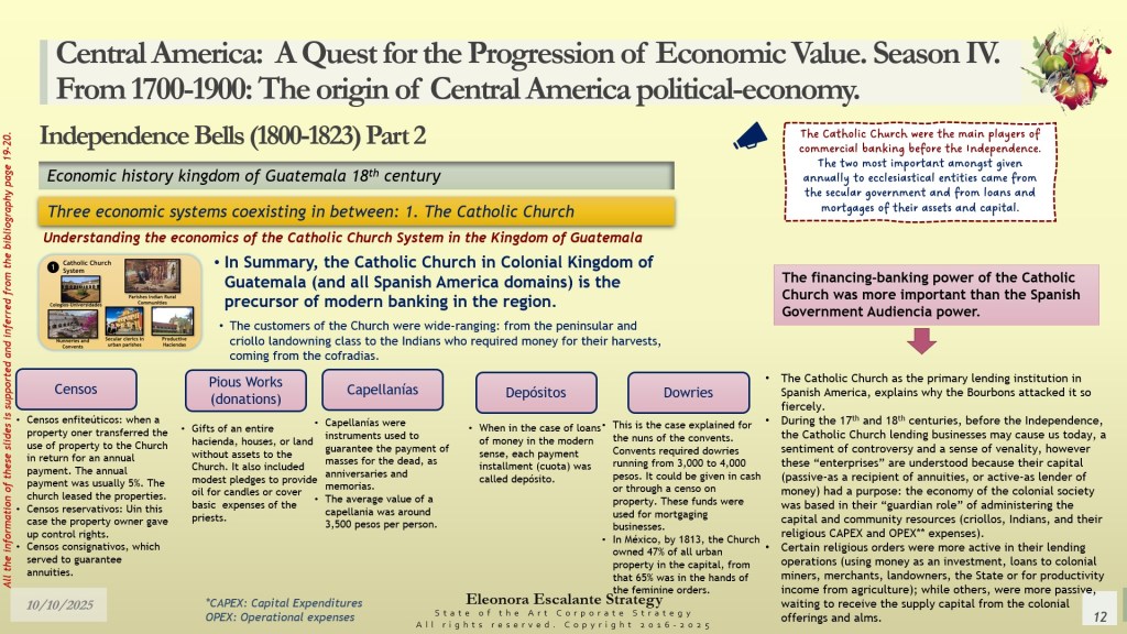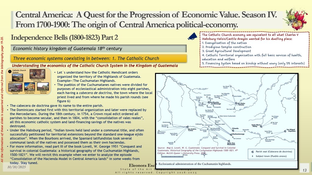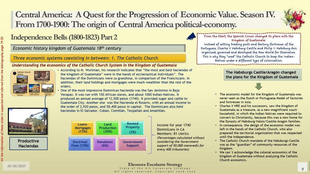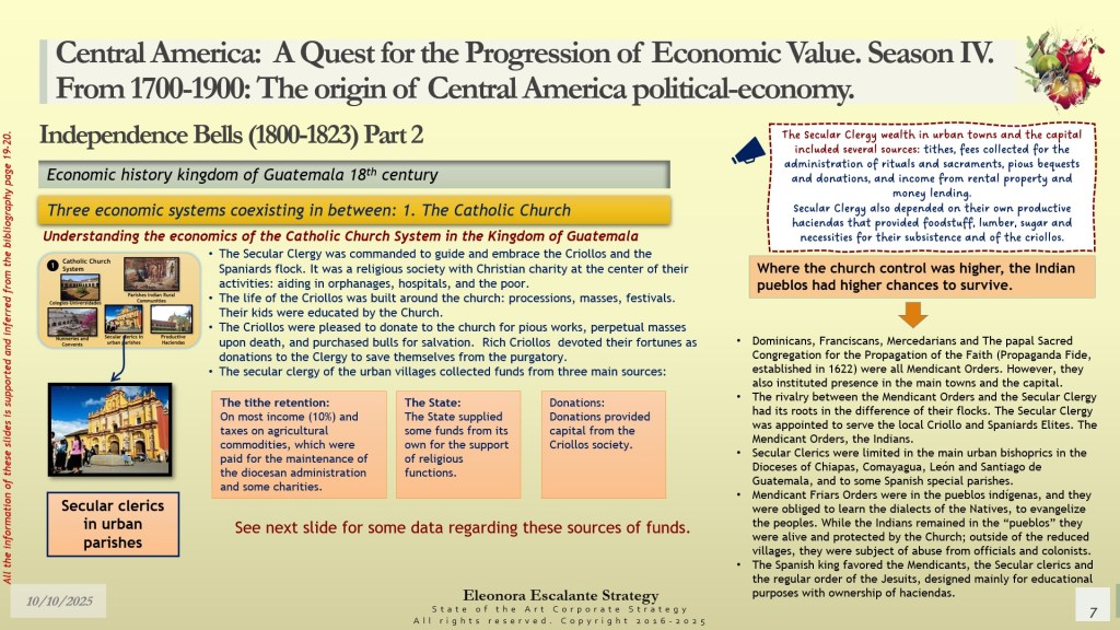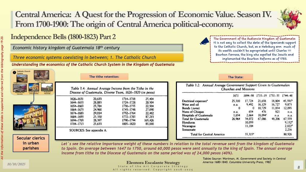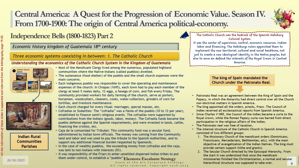 The Economic History of the Kingdom of Guatemala during the 18th Century. Slides 5 to 15. Episode 4. Our strategy house has identified three economic systems in the Kingdom of Guatemala. They were separate in between (even physically), only integrated through limited lines of commercial interests and rituals through the Catholic Church. The main economic system was the Catholic Church organization, the second one was the Indian-Native subsistence tribute system, and the third one was the Colonial Criollos society. Last week, we accomplished a detailed description of each of these three systems, and we consider these 10 slides of top importance, with tons of details, and self-explanatory examples. Please read this new material and our strategic reflections written in slides 5 to 15-Ep. 4. Each slide has gathered the essence of the best of our professors of history who have authored the books that I have added to the bibliography of Episode 4. The real reason for the economic collapse of the Kingdom of Guatemala before September 1821 was the destruction of the Catholic Church Economy by the Bourbon Reforms. The Catholic Church was the backbone of the Kingdom of Guatemala’s society.