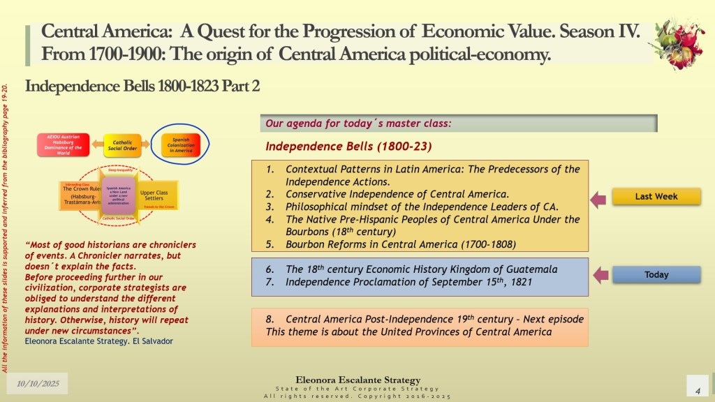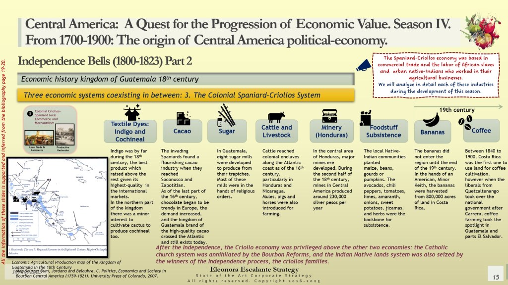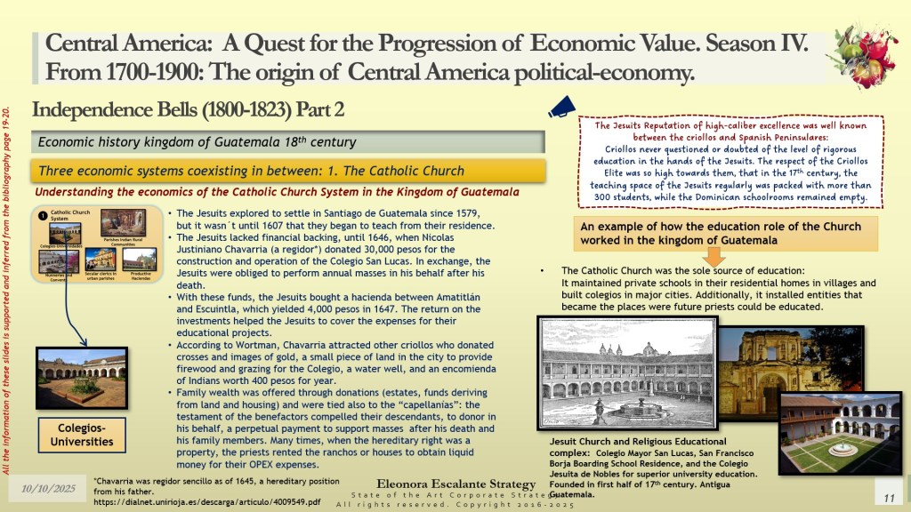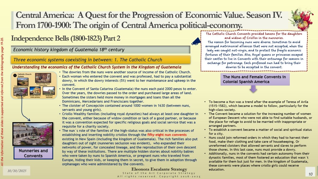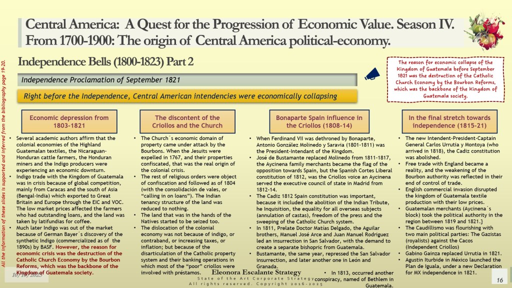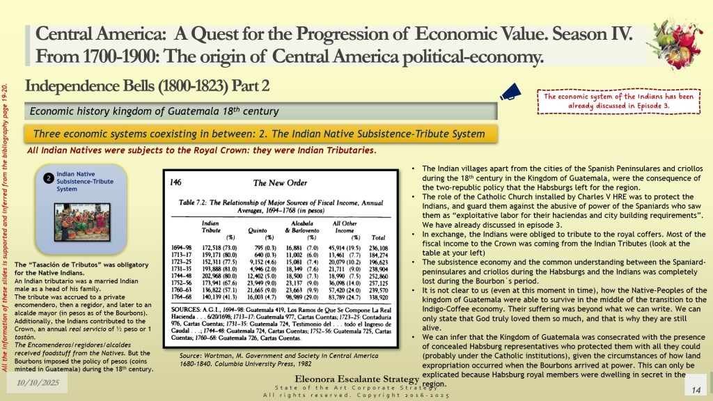 The Economic History of the Kingdom of Guatemala during the 18th Century. Slides 5 to 15. Episode 4. Our strategy house has identified three economic systems in the Kingdom of Guatemala. They were separate in between (even physically), only integrated through limited lines of commercial interests and rituals through the Catholic Church. The main economic system was the Catholic Church organization, the second one was the Indian-Native subsistence tribute system, and the third one was the Colonial Criollos society. Last week, we accomplished a detailed description of each of these three systems, and we consider these 10 slides of top importance, with tons of details, and self-explanatory examples. Please read this new material and our strategic reflections written in slides 5 to 15-Ep. 4. Each slide has gathered the essence of the best of our professors of history who have authored the books that I have added to the bibliography of Episode 4. The real reason for the economic collapse of the Kingdom of Guatemala before September 1821 was the destruction of the Catholic Church Economy by the Bourbon Reforms. The Catholic Church was the backbone of the Kingdom of Guatemala’s society.