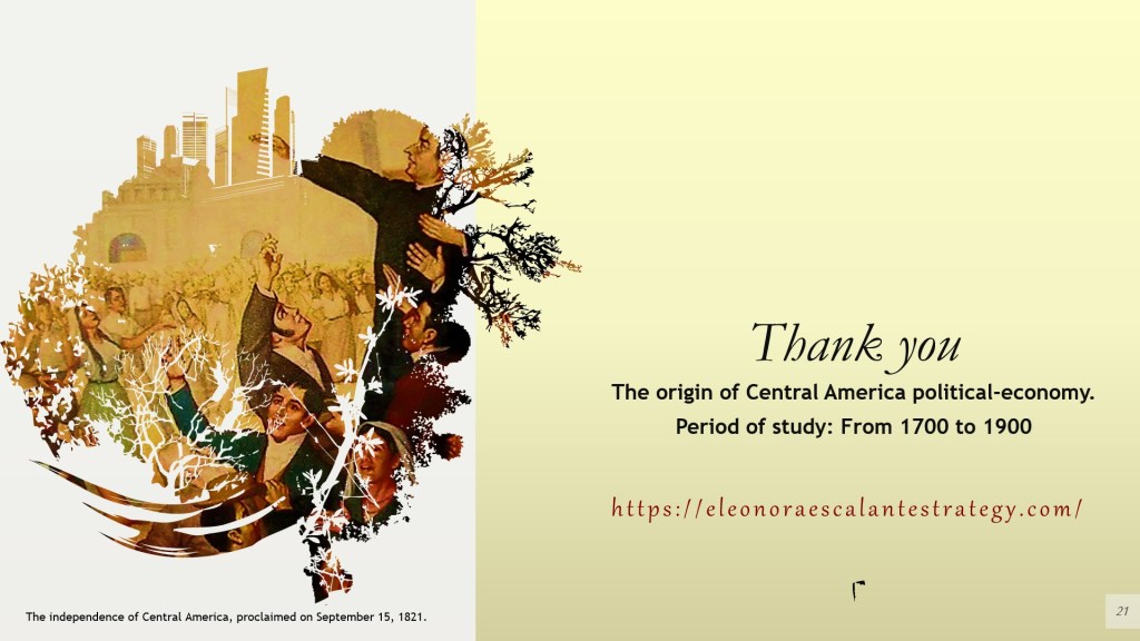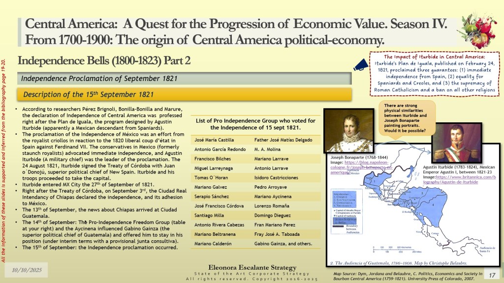 Slide 16-Ep.4. offers a summary of the most relevant logs of the period between 1800 to 1821. The Kingdom of Guatemala was trying to find a door entrance to the mercantilist system that was rolled out between Britain and America before the American Revolution and the Seven Years’ War. The Criollos’ economy was in need to find a star product that could help them to prosper. Indigo cultivation was promising a fantastic future. However, Britain blocked the door. The indigo was also planted in India (Bengal) and Caracas, and the international low prices made the Central American textile dyes totally irrelevant, simply a prosperity dream that was never true. In addition to the economic contradictions of the region, the fear of anarchy that could steal the Catholic structure of the Central American Society was so ingrained in the caudillos of the 4 main intendencies (Chiapas, Comayagua, León-Nicaragua, and San Salvador) that they refused to change under the Bourbons. The Bonapartes blocked the Bourbons in Spain, while in Central America, the Criollos decided to follow Iturbide after the Plan of Iguala, because they had no other choice. Slide 17-Ep. 4 explains the process of the Independence, who were involved directly, and how the pro-independence group voted for the separation from Spain. Historian Lindo Fuentes (Fordham University) has authored a book in which he explains why El Salvador deserves to be called the troublemaker of Central America (2). Despite that, Lindo´s work is focused on the 20th century; El Salvador was an “alborotador” since the Independence epoch. See slide 18-Ep.4. We can observe the remarkable protagonism of the Salvadoran elite social class by their decision not to join Iturbide´s empire, declaring war against the army of Guatemala, and on top of that, how El Salvador requested help from the United States of America to contain the situation. Nothing of that happened as a mere fortuity. El Salvador had people who knew in advance that Iturbide was not going to prevail. Lastly, the United Provinces of Central America project, under Father José Matías Delgado, was going to take place as of 1824.