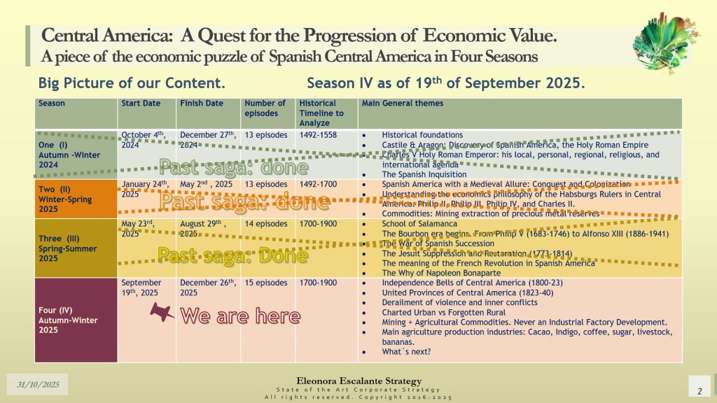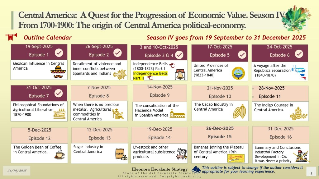Our last day of October has docked, and with it, our episode 7 has been changed. In our quest to provide a complete picture of the philosophical mentality of the leaders of Central America, we have completed a lovely chapter: The Philosophical Foundations of Agricultural Liberalism during the last quarter of the 19th century. The paradox between urban and rural will be added in the episode about the consolidation of the hacienda model in Central America.