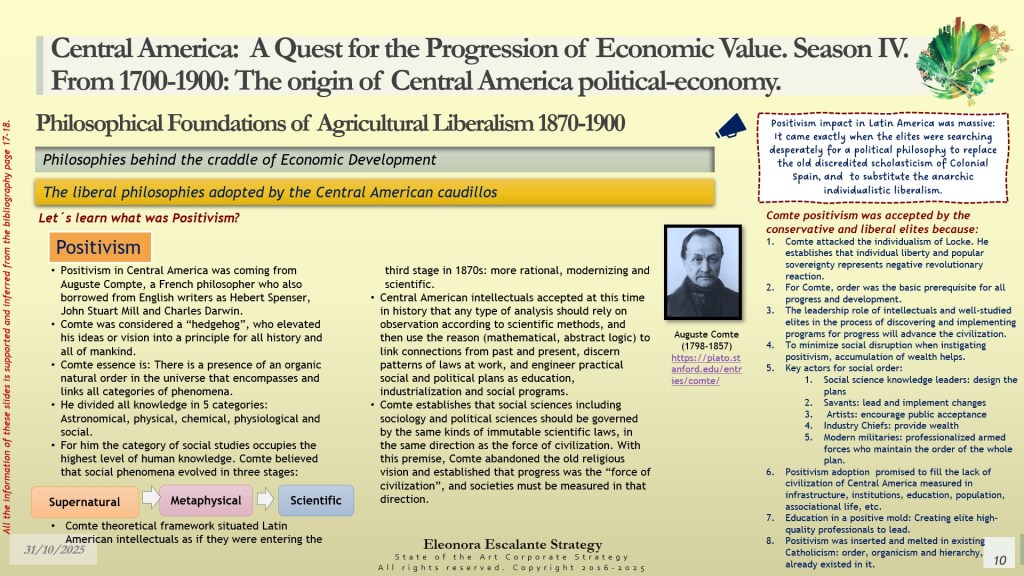 - Positivism (Slide 10): Auguste Comte (1798-1857). Positivism was enormously accepted and adopted by the ruling class. It was an under-covered summary version of the Enlightenment that did not name any of the Enlightened European thinkers. Comte (a French philosopher) was not only aligned with the priorities and troubles of the Central Americans who were building their nations, it also kept the unity of thought among them. Slide 11 shows each of the reasons why positivism triumphed in this region. And unbelievably, it was the positivism that helped to hinder and defeat the other USA liberal influence in the region. Incredible! It was a unique Central American liberalism under Comte’s sway.