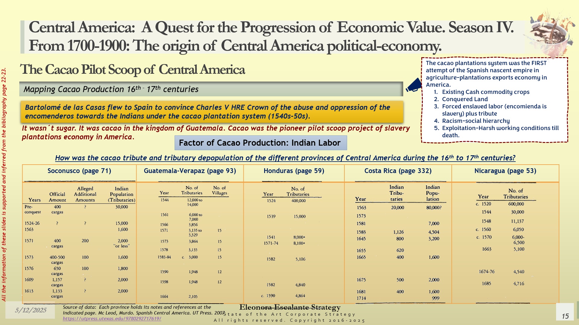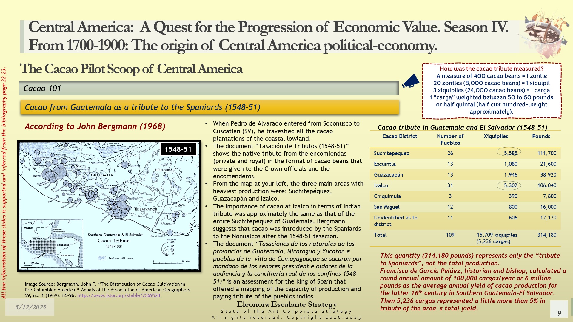 How did the Spanish conquistadores find the cacao plantations in America? From the first discoverer, Columbus, to Hernán Cortés and Pedro de Alvarado, they all encountered extensive cacao orchards cultivated by the Aztec and the Maya civilizations on both sides of the ocean borders (Pacific and Atlantic). However, according to researcher John Bergmann (1968), the core major cacao production districts were in Tabasco (MX), Soconusco (Chiapas), Suchitepéquez (GUA), Izalco (SV), and Sula Valley (Honduras). See slide 8. Regarding Central America, the region of Soconusco was suited for cacao cultivation. The patterns of the indigenous communities of the Soconusco (see map above) in relation to cacao planting were to keep the heavily forested environment the most. According to researcher Janine Gasco (1), cacao was planted the most in this territory between 1800-400 BC. However, by the time of the arrival of Hernando Cortés, the Soconusco natives were tributaries to the Aztecs, and the main utilization of cacao was to send it annually to the Aztecs. Additionally, the cacao was one type of tribute good (cultigens) that was used for domestic transactions. During the first quarter of the 16th century, the Soconusco population density was 7 people per km2, but during the entire colonial period, it was reduced to 1.5 people per km2. The mortality rates in all the cacao pueblos were as high as 95% or more during the first 60 years after the imposition of the Spanish colonial rule, and this impacted the cacao economy a lot, despite the requirements of the Spanish officers and encomenderos. In the Izalco region, the situation was not better than in Guatemala when it comes to the decrease in cacao workers. Between 1548-51, researcher Bergmann stated that there were 109 native pueblos from the Cacao District (see slide 9) paying 314,180 pounds of cacao as tribute to the Spaniards. These numbers are also confirmed by other sources, and by projection, we can infer that at least 6 million pounds was the average annual yield of cacao coming out of Southern Guatemala and El Salvador. This data source is from an analysis of cacao “taxation” which was officially studied and assessed by order of Charles V HRE (and the young Philip II Habsburg-Aviz). Moreover, slide 10 also shows a summary of the situation of cacao for the rest of the secondary cacao regions, the Sula Valley-Caribbean Honduras, the Nicaragua Nueva Jaén zone, and the Costa Rican Llanuras de los Guatusos. Since the Spaniards were also intertwined with the Portuguese, when the Portuguese began to export slaves for their sugar plantations in Brazil, it was quite normal for them to use the same business model of slavery within the Kingdom of Guatemala. The encomienda was slavery. And it was the award given by the Spaniard Crown to its staff in the kingdom of Guatemala. The core Cacao Plantations were already producing pods, and in consequence, the Spanish encomenderos only used the same established and existing tribute structure of cacao, but for them. Most of the cacao sales were traveling to México, and from there to Spain.