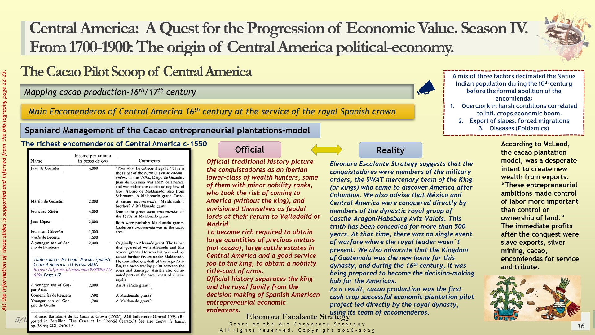 The Spaniard management of the Cacao-entrepreneurial plantations model has been described by MacLeod. By the year 1550, he had identified several encomenderos; the richest of all was Juan de Guzmán with 4,000 gold pesos per annum. See the table at slide 16. Let´s notice that the Spaniards replicated the same pattern of the Portuguese crown when it comes to the use of slavery in plantations. Additionally, we would like to recall that the Portuguese crown was part of the Habsburg family since the patriarch Maximilian Habsburg Aviz, then again, when Isabella Aviz married Charles V HRE. Additionally, Philip II Habsburg-Aviz held strong ties with Portugal when he married his niece María Aviz-Habsburg, and later when he succeeded the Portuguese throne in 1580.