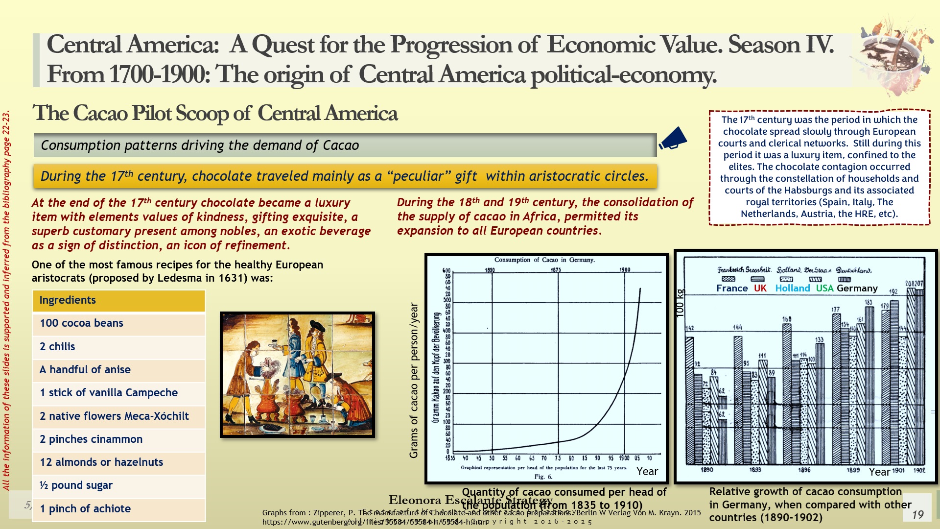 This chapter goes back to the 16th and 17th centuries. The Audiencia de los Confines, known as the Kingdom of Guatemala, was one of the most productive regions for cacao after Pedro de Alvarado’s conquest. This region was one of the most relevant zones for high-quality cacao production. The demand for chocolate has its foundations in history, and Europeans have always been the main clients of it.
