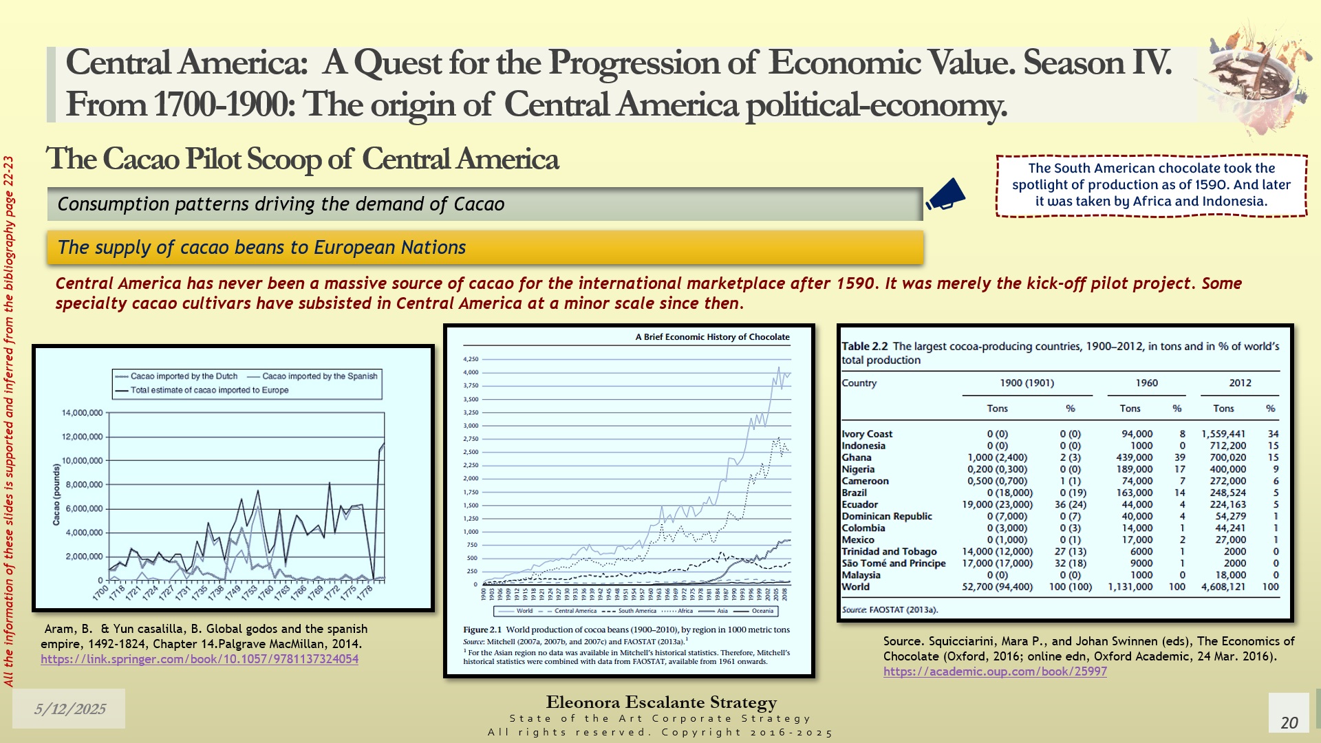 The scoop on the move: Cacao Horizontal Growth Trajectory 18th-19th centuries. Slide 17. We have compared two academic papers about how the cacao production moved from America to the Old World. The first paper from Cilas-Bastide (2020) helps us to observe the trajectory (by year) of how the cacao plantations moved from Central America, to Ecuador, Guyana, parts of Colombia, and Venezuela during the 17th century; and how Brazil (Amazonian Theobroma) was later exported by Portuguese merchants as of the 18th century. When African slavery was abolished in the New World by law, the cacao plantations were introduced and potted in Africa, parts of India, and Asia. This trajectory confirms that cacao producers were constantly looking for cheap human resources for the exploitation of the cacao farms. When the Indian Central American population was almost reduced to zero by 1590, the cacao plantations moved to South America. When African slavery was abolished, during the 20th century, the supremacy of the cacao plantations was moved to African nations, which are currently producing around 70% of it.