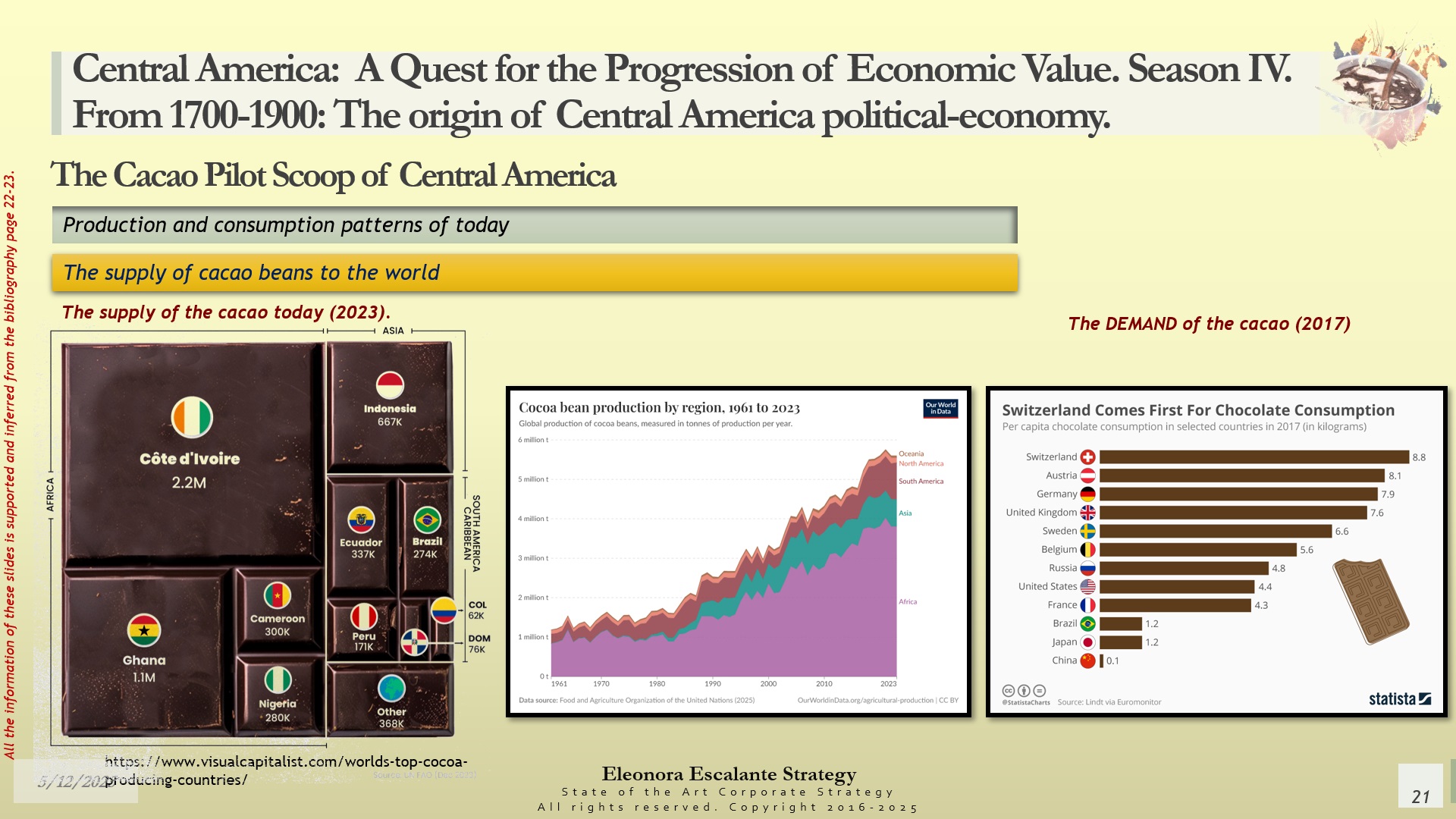 Finally, we see a protagonist role of the Dutch in relation to cacao exports during the 18th and 19th centuries. Slide 20 also demonstrates that the production of cocoa beans has never been relevant in Central America as of the year 1590. The production of cacao has moved to Africa and Asia (Côte d’Ivoire, Indonesia, Ghana, Nigeria, Cameroon), while the two main centers of production in America are still Brazil and Ecuador.
