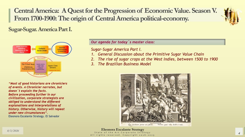 Our document for the strategic reflections of Monday is shown below. The agenda for today is defined in three subjects: (1) General Discussion about the Primitive Sugar Value Chain; (2) The rise of sugar crops in the West Indies, between 1500 and 1900; and (3) The Brazilian Business Model of sugar plantations. As usual, please, we kindly encourage you to read this material and pursue additional research in each of the slides. Feel free to discuss the content with your friends, professors, colleagues, and family. We are arriving at the essential core of all these 4 previous seasons.