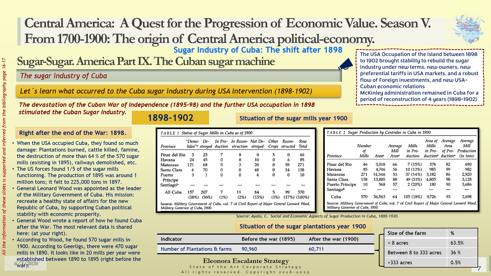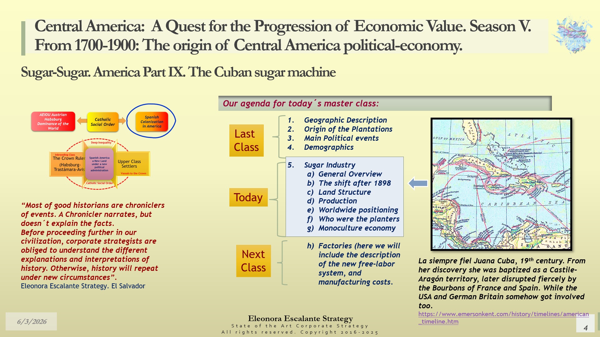 With the occupation of Cuba by the USA in 1898, there were multiple challenges and decisions for the Sugar planter class of Cuba. The war military forces of the USA directly accompanied Cuba´s transition into a Republic, first between 1898 and 1902, and then after 1906 for another three years. Our agenda for today´s master class is as follows: