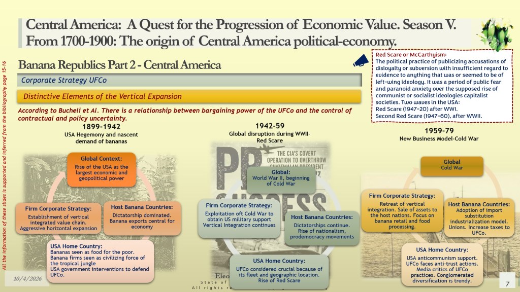 The importance of learning about the Banana Republics lies in the mega dimension of the endeavor that took the region by storm. To build a banana empire, moving bananas to consumers in North America and Europe, using vertical integration, horizontal growth, and diversification could not have ocurred without the geopolitical support of the top spheres of influence of the White House and its agencies. Additionally, several elements made us consider the role of MNCs in emerging and developing economies. On the one hand, without the entrance of UFCo, several infrastructure, communications, and connectivity projects would have never been built. However, on the other hand, when the interests of the international corporations collide with