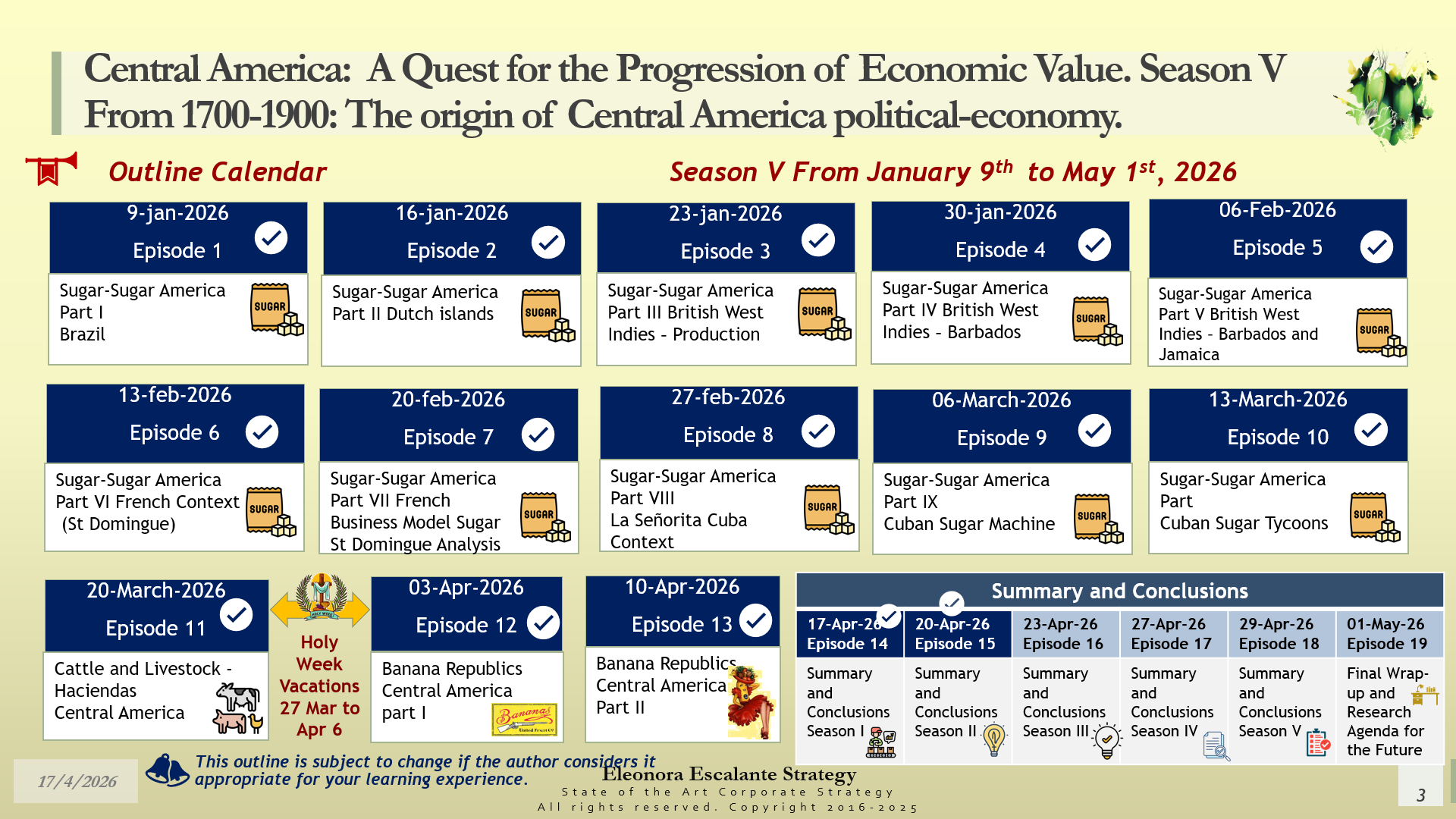 Please take notice of the calendar of the next episodes. We are working non-stop to finish all before May 1st. Our next episode is about the summary and conclusions of Season III. It is super important to accomplish these summaries. Our work has lasted more than 18 months, and we need to review everything in detail.