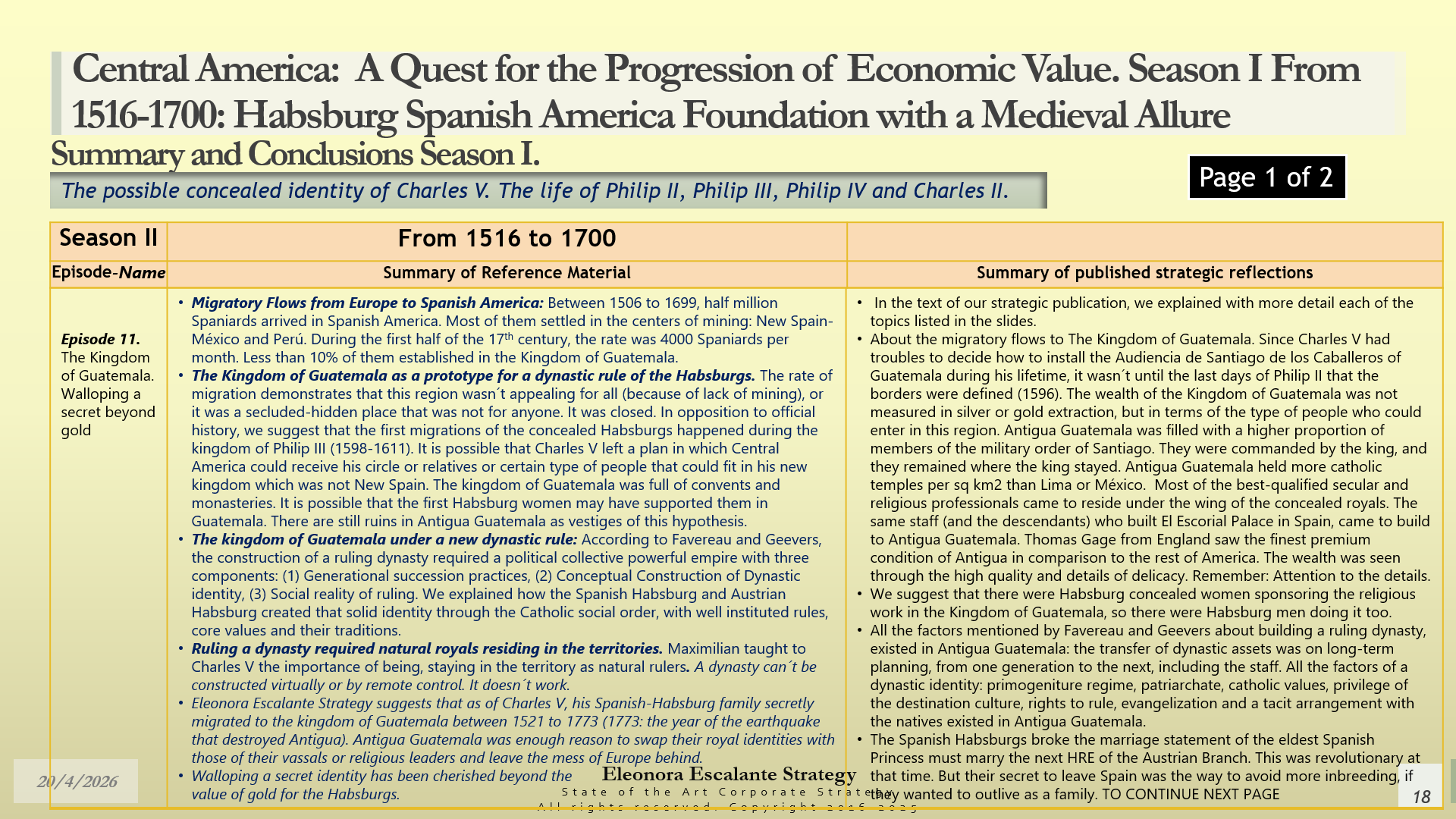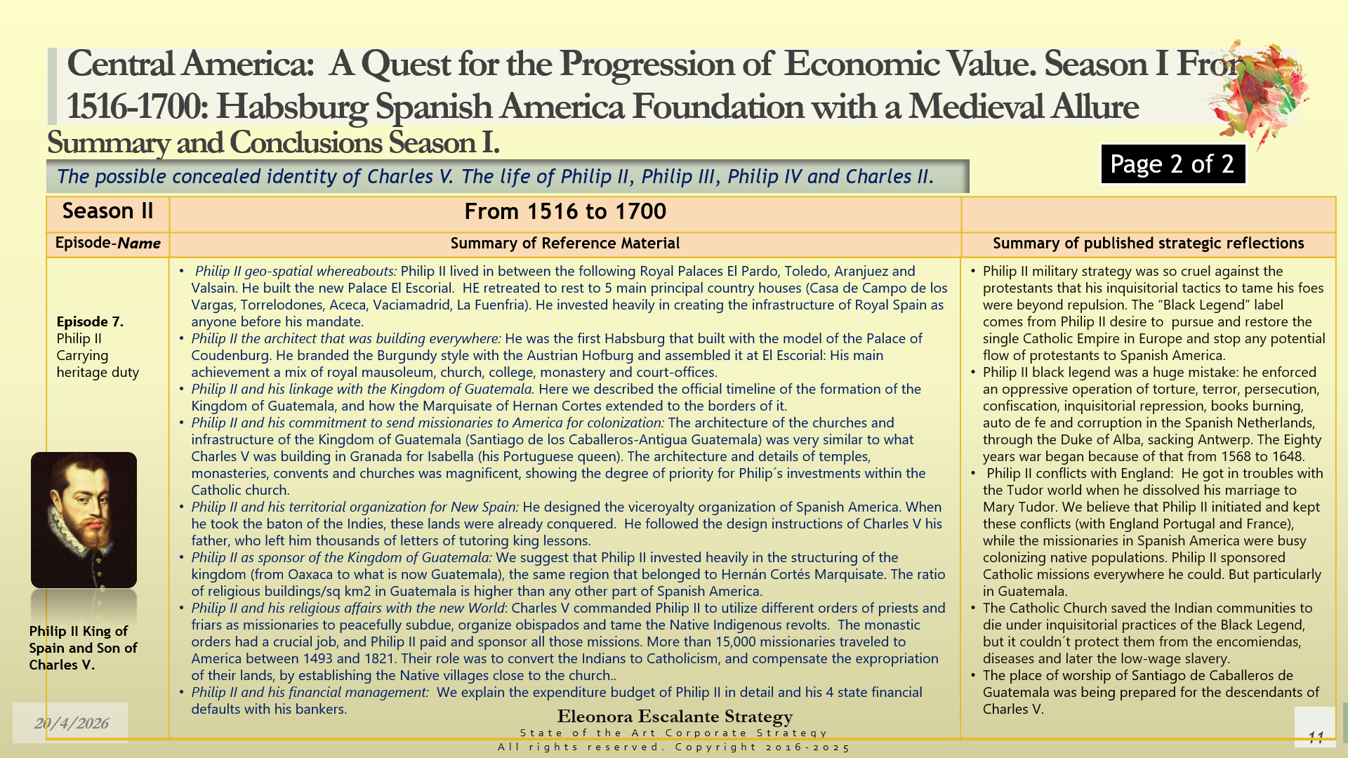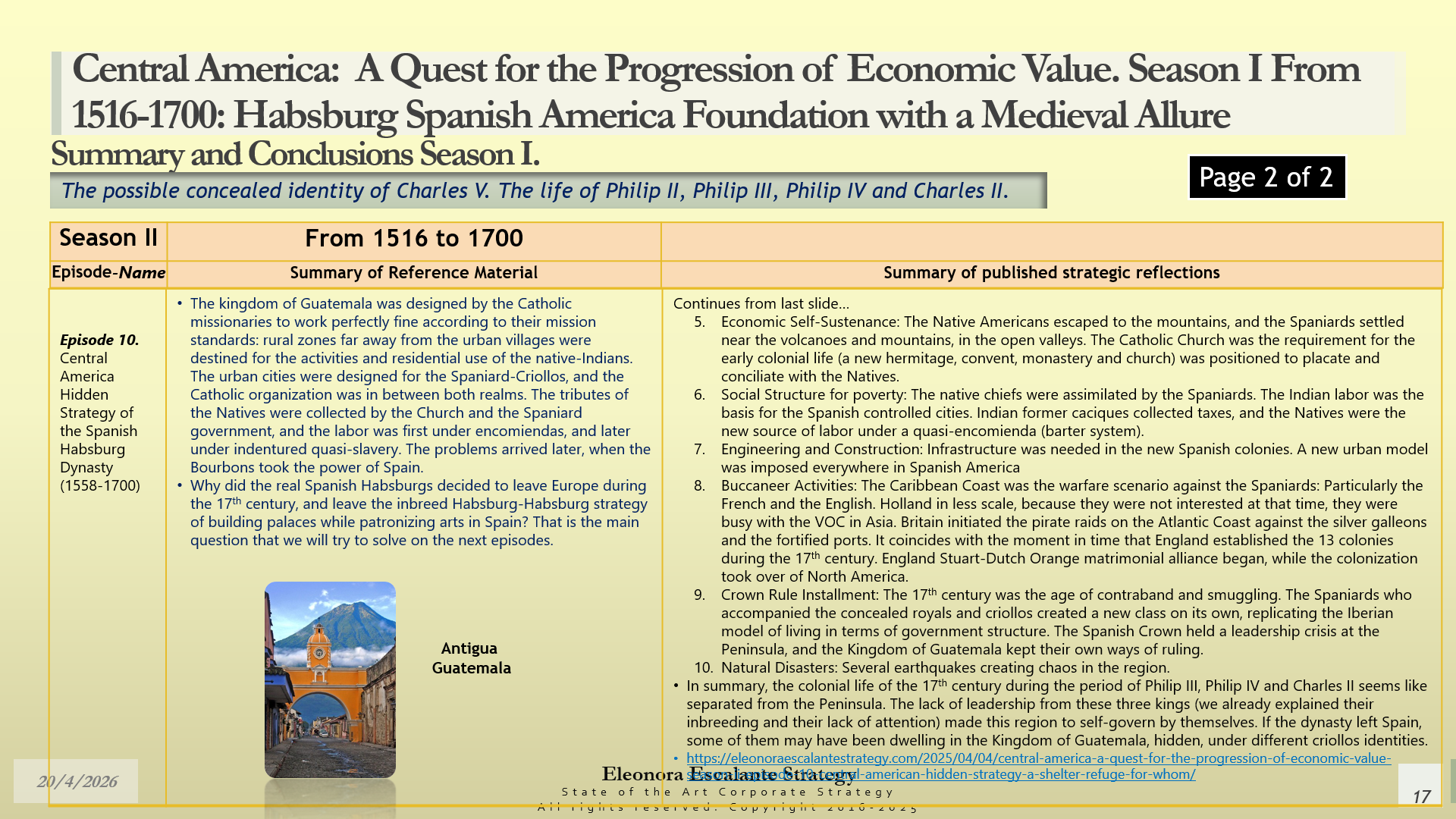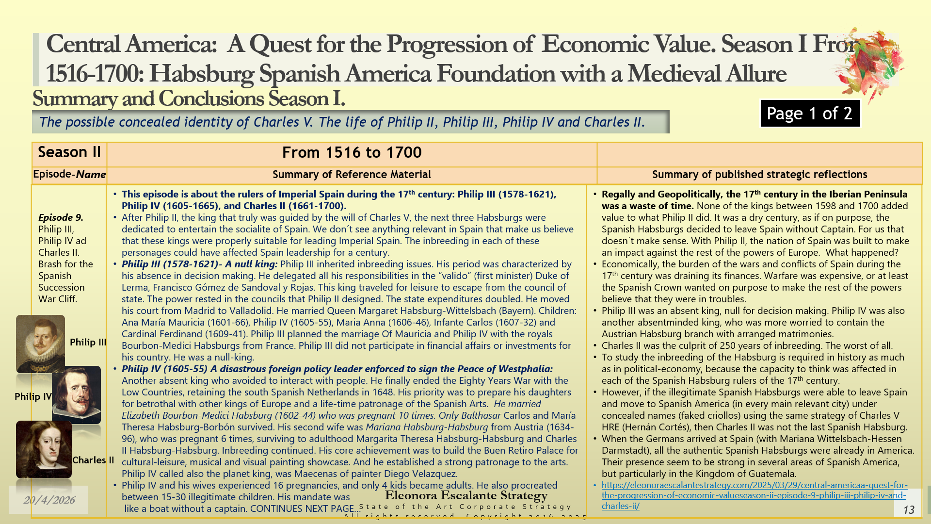 Conclusions of Season II. Central America: A Quest for the Progression of Economic Value. Period of study: From 1516 to 1700: Habsburg Spanish America Foundation with a Medieval Allure. The Possible Concealed Identity of Charles V. The Life of the Spanish Habsburg Kings of the 17th century: Philip II, Philip III, Philip IV, and Charles II.