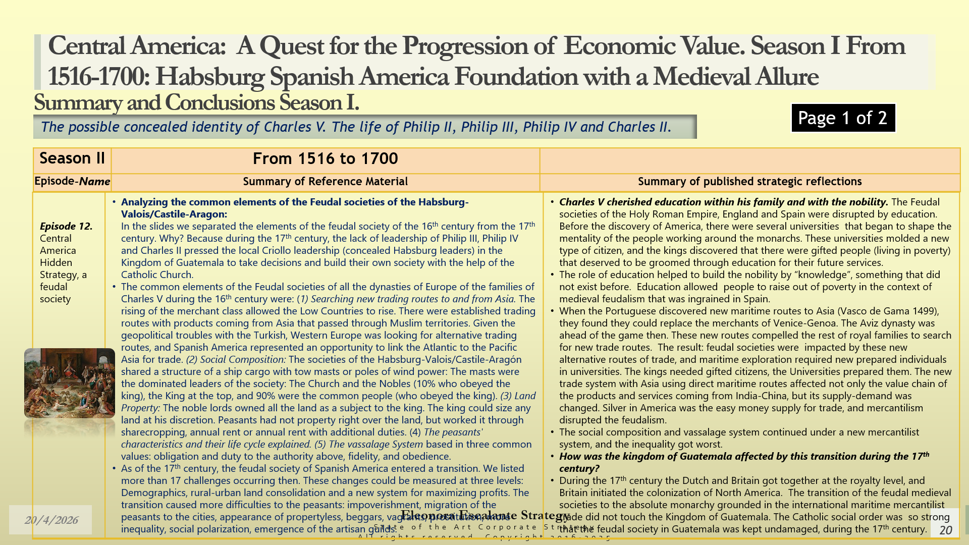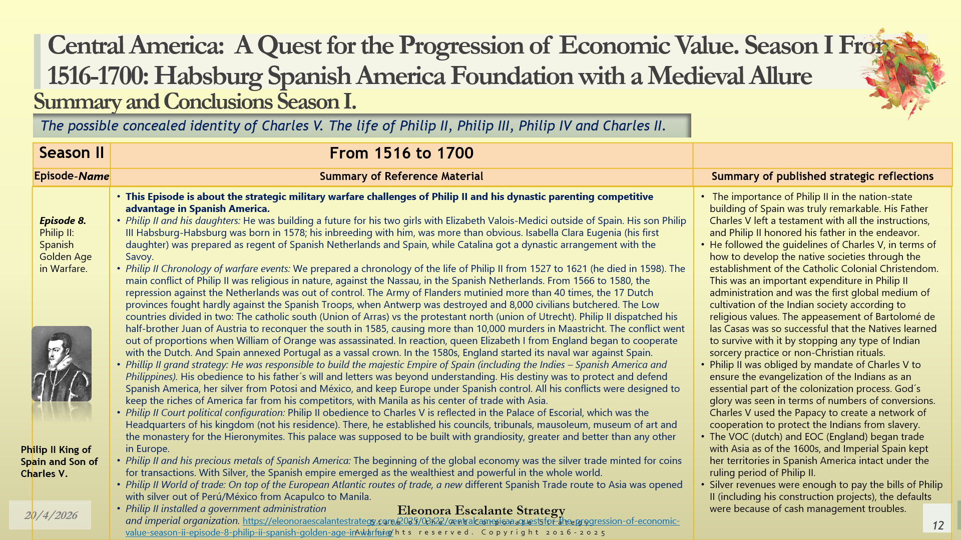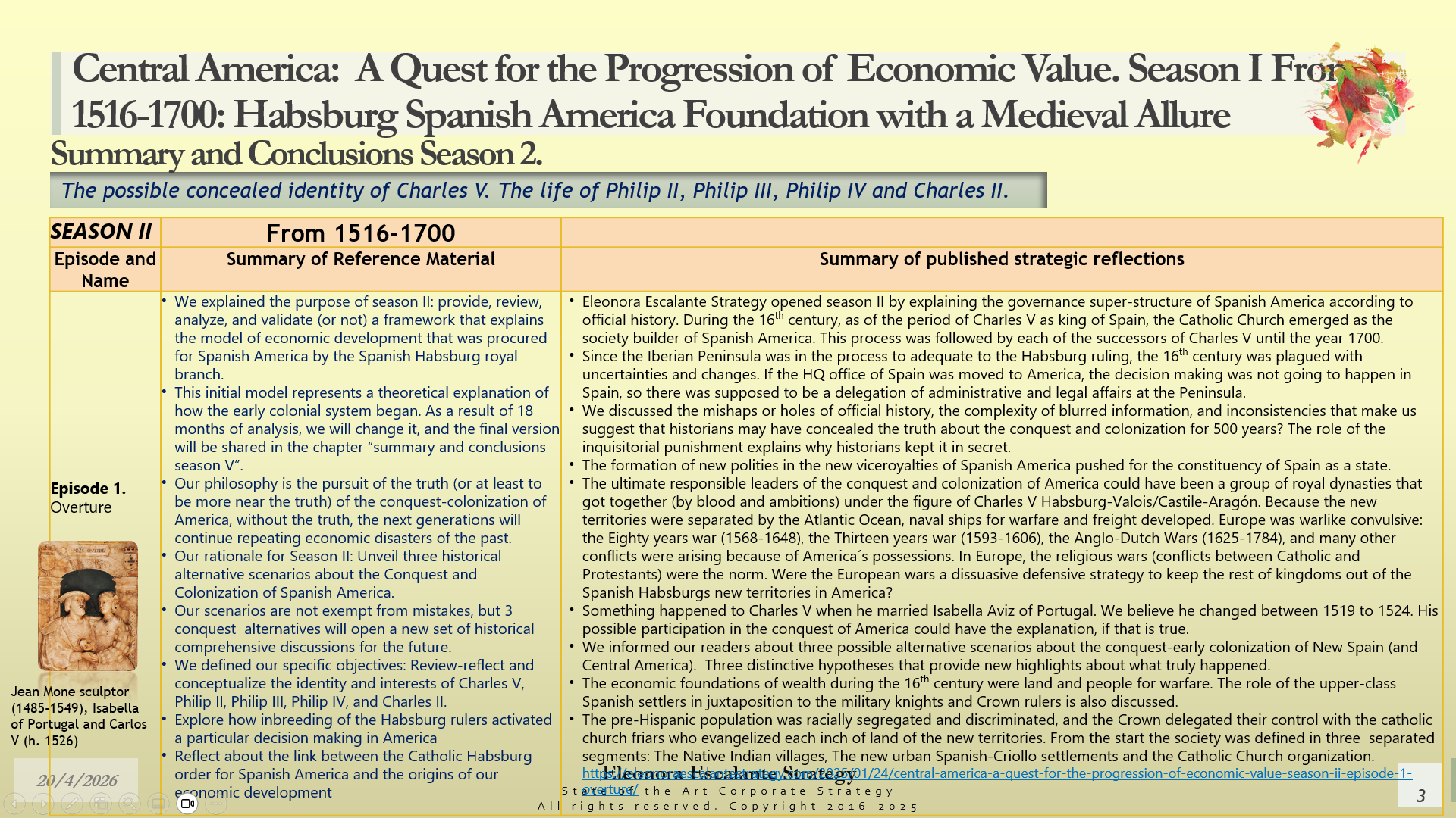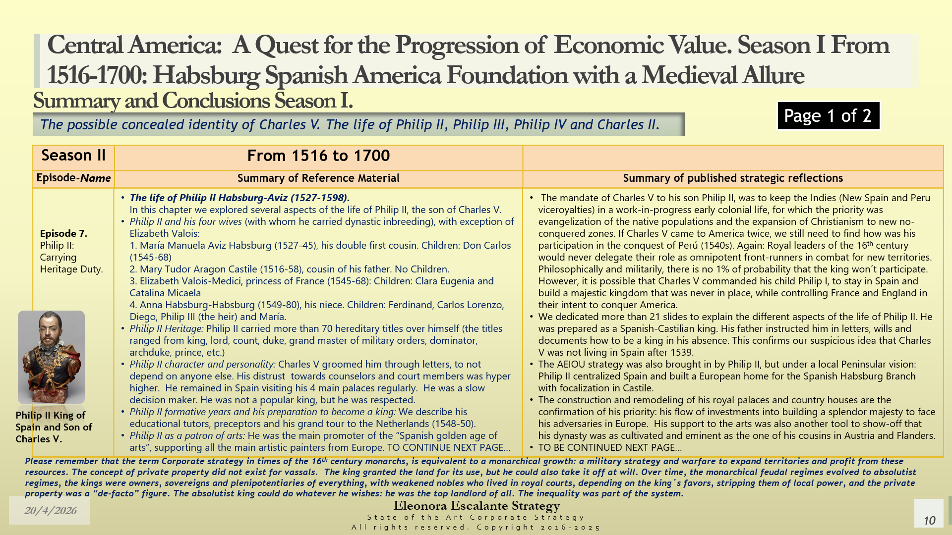 Conclusions of Season II. Central America: A Quest for the Progression of Economic Value. Period of study: From 1516 to 1700: Habsburg Spanish America Foundation with a Medieval Allure. The Possible Concealed Identity of Charles V. The Life of the Spanish Habsburg Kings of the 17th century: Philip II, Philip III, Philip IV, and Charles II.