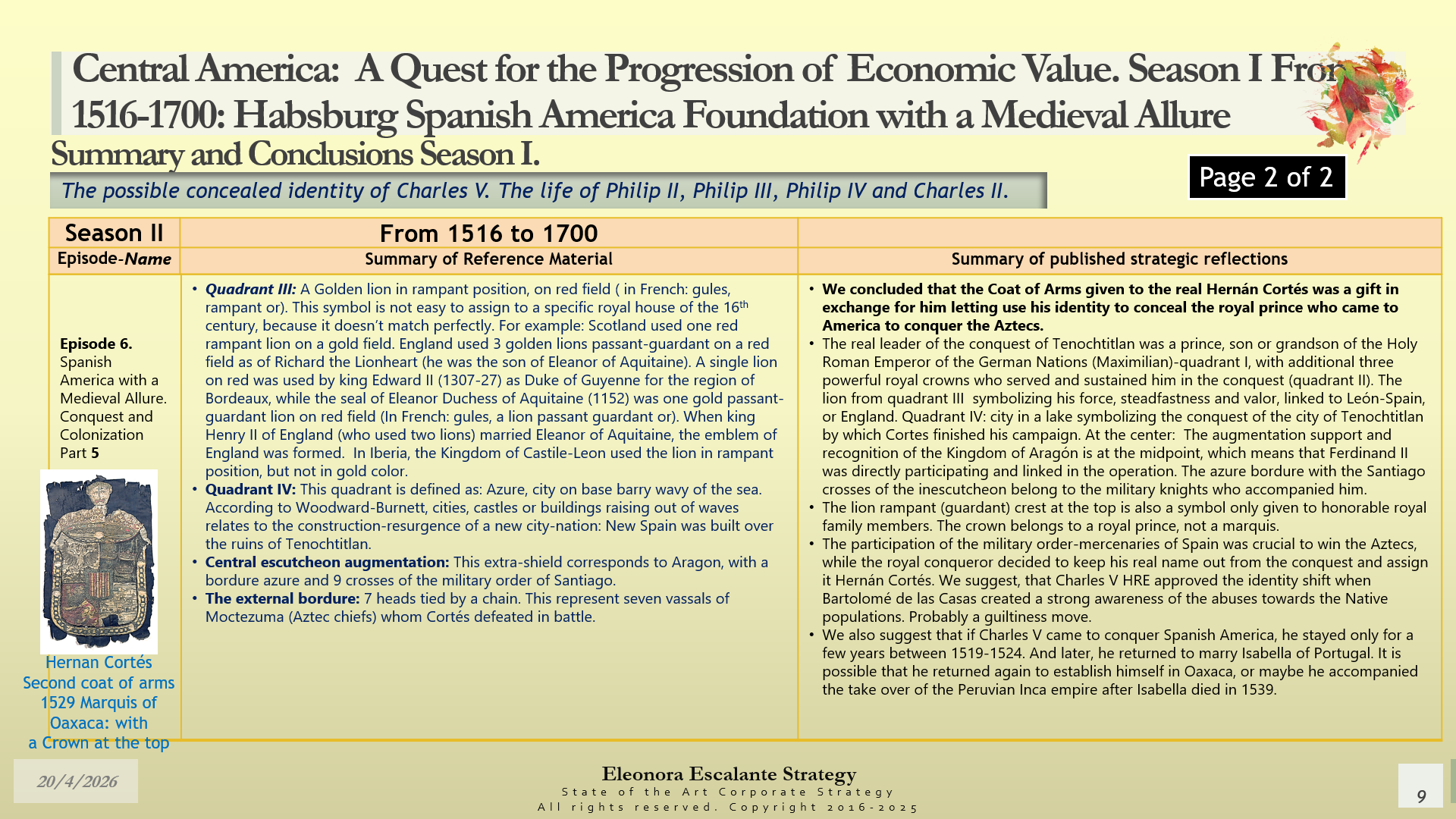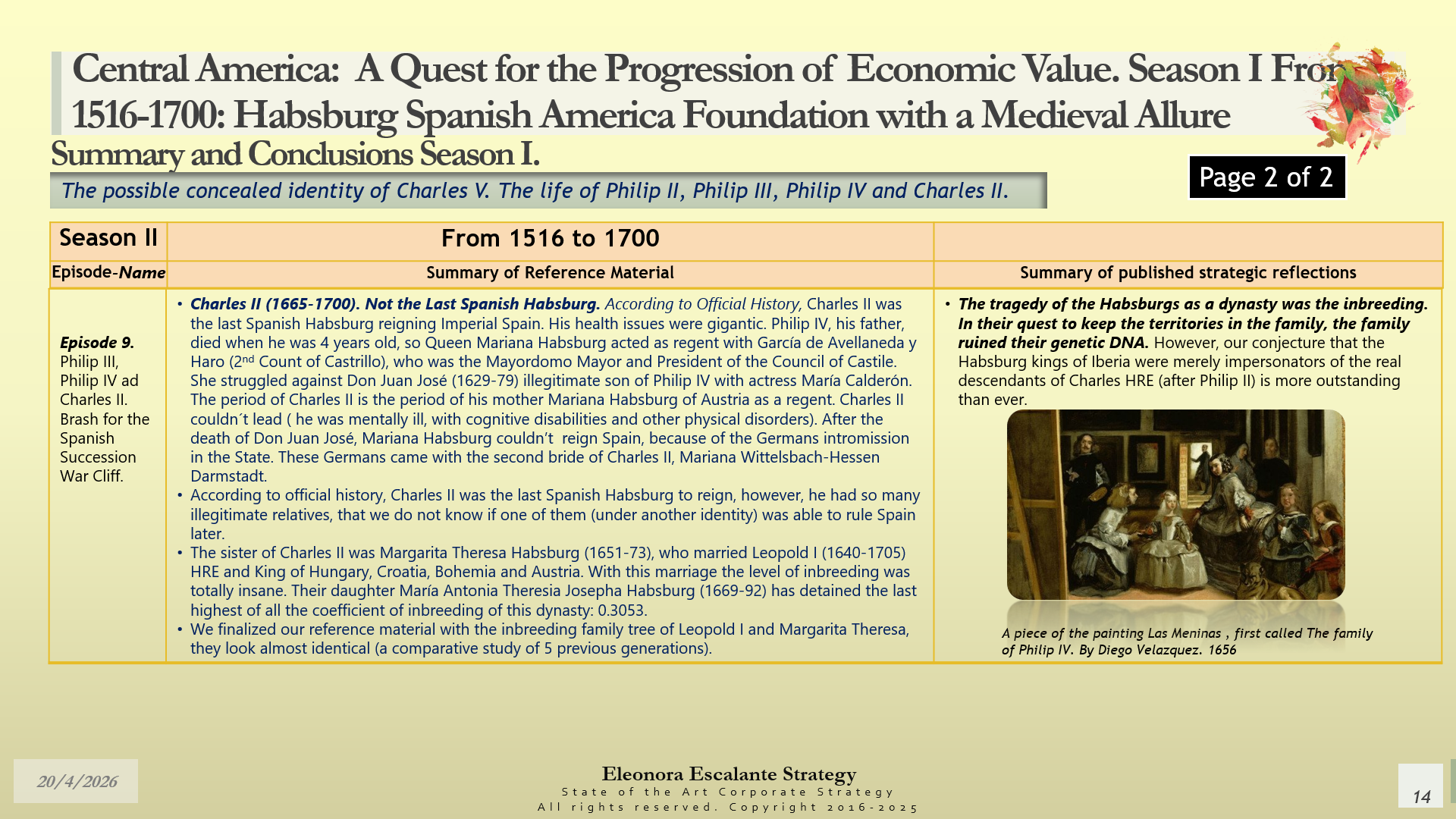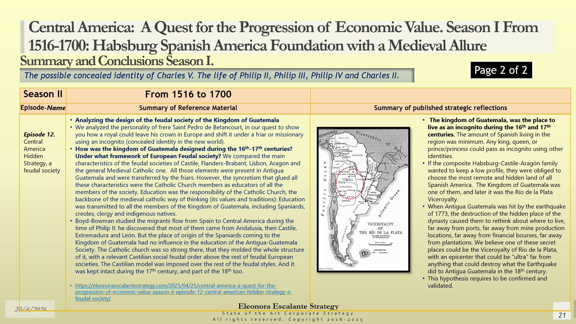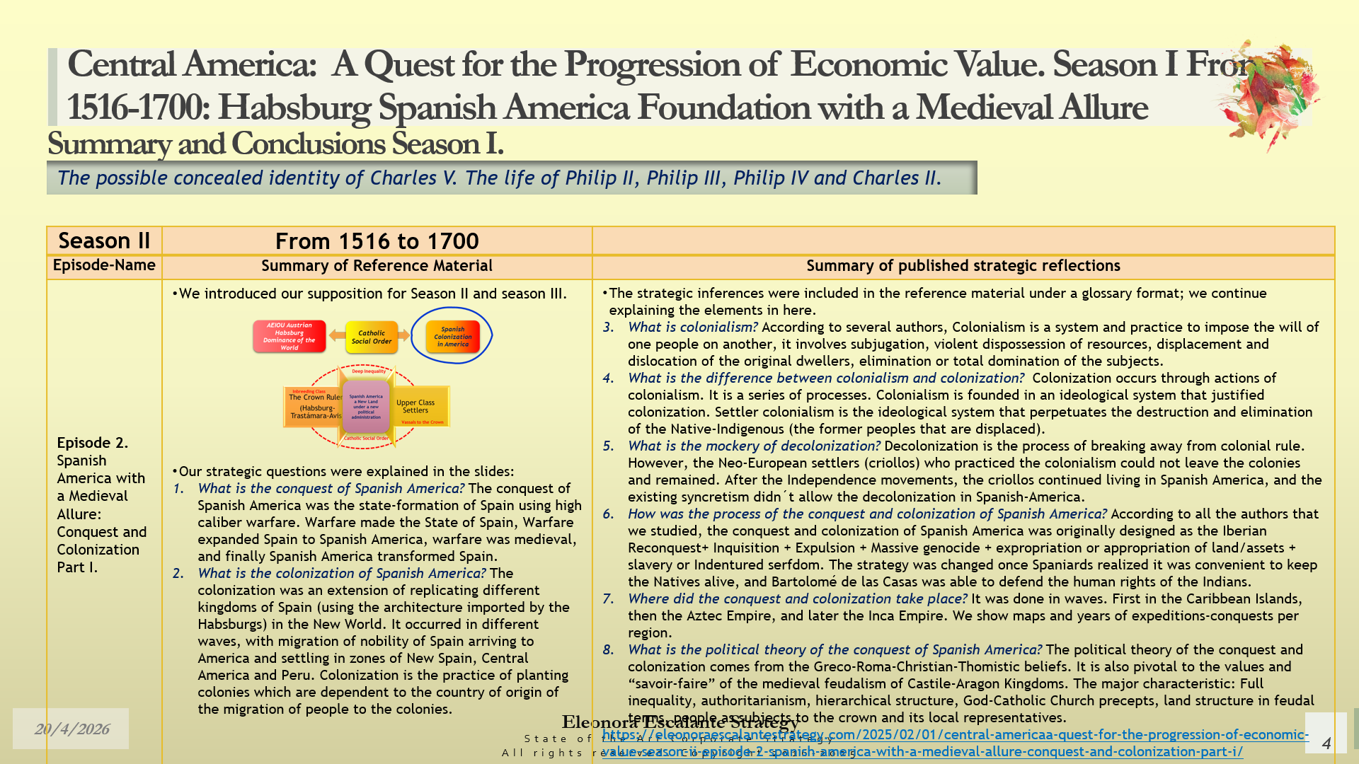 Conclusions of Season II. Central America: A Quest for the Progression of Economic Value. Period of study: From 1516 to 1700: Habsburg Spanish America Foundation with a Medieval Allure. The Possible Concealed Identity of Charles V. The Life of the Spanish Habsburg Kings of the 17th century: Philip II, Philip III, Philip IV, and Charles II.