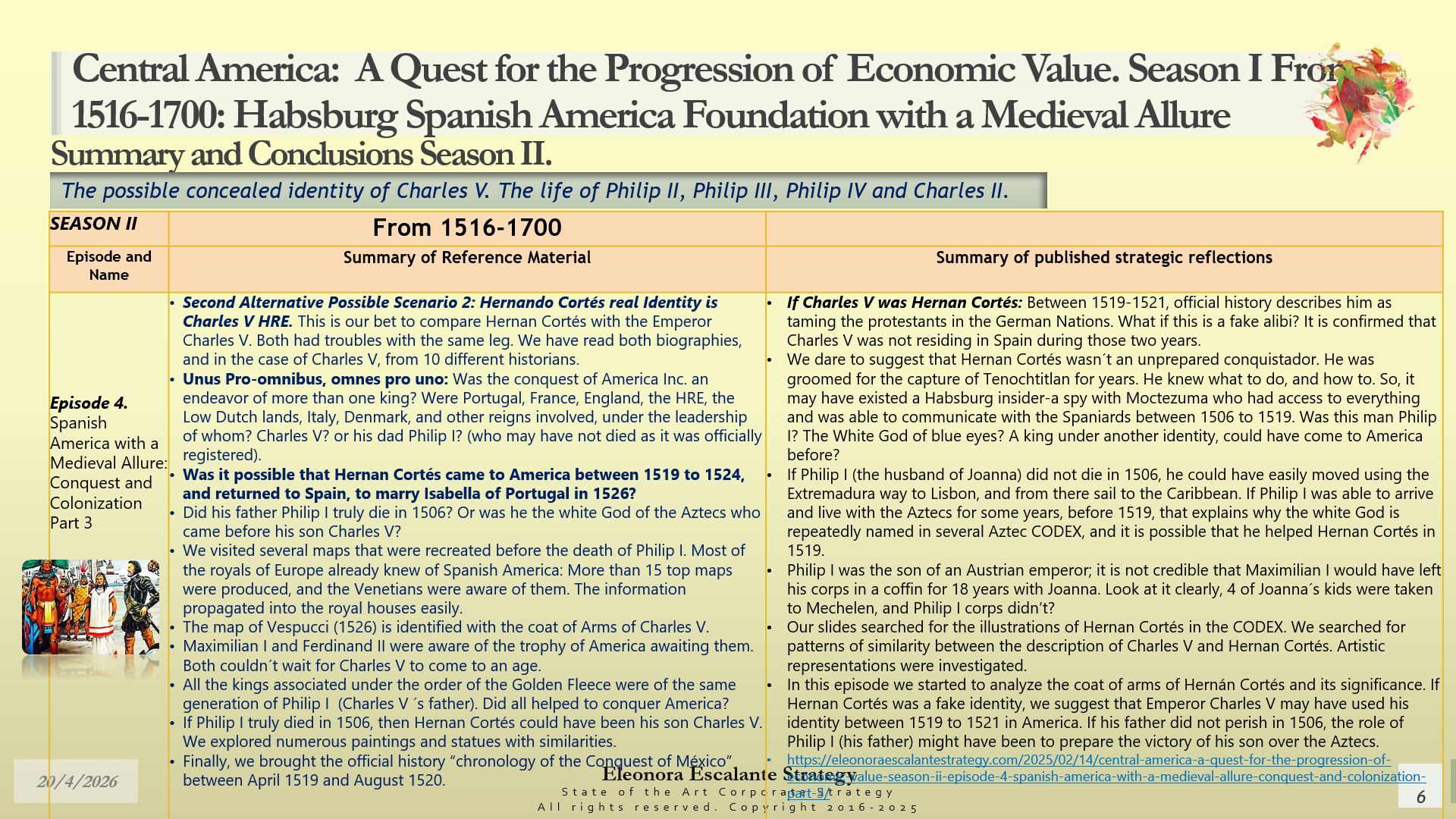 The main conclusion of these 14 episodes is a mystery. Something beyond our current understanding happened during the 17th century. The kings of Spain after Philip II were not at the same level of mental discernment and achievement in the New World as what Charles V, Holy Roman Emperor, created for the Spanish Habsburgs in America. Philip II did what his father wrote to him to do. Charles V HRE could have shifted his identity (or not) with the conqueror Hernán Cortés. We can´t corroborate it. We have investigated all the possibilities (3 of them) using our knowledge and following our research instincts. But something that is beyond our imagination occurred after the conquest of the Aztecs. And that mystery is what we have tried to decode.