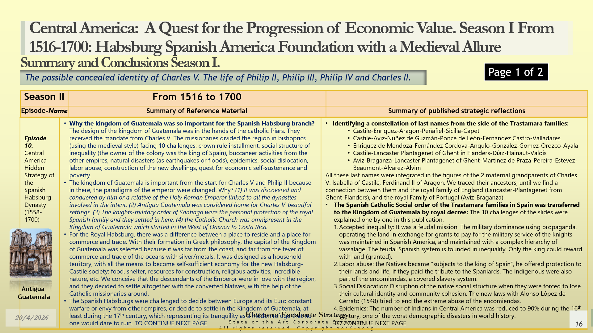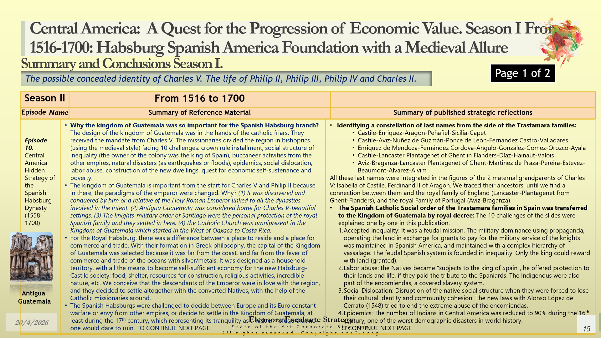 After Season II, our contribution to the history of corporate strategy and the history of the political economy of the Kingdom of Guatemala is connected to the importance of assessing all the true core situations and edges of this region in relation to the European monarchical history. We can´t sustain an European historical economic path for Europe without considering Spanish America or Asia. The same happens with Central America. Every single move in any of the regions of America was tangled with the Empires of Europe. Moreover, if we confirm that a branch of a composite monarchy, such as the Spanish Habsburg descendants of Charles V, moved their residence to the Kingdom of Guatemala after Charles V´s death, that piece of information is as relevant as a pure diamond of the most elevated quality. Can you believe that we have been living an historical lie for more than 500 years?